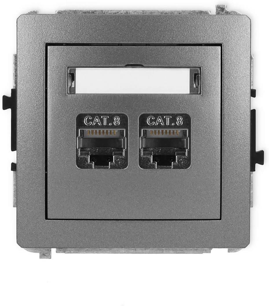 Gniazdo komputerowe podwójne RJ45 kat.8 ekranowane w kolorze grafitowym z serii DECO, marki Karlik. Gniazdo komputerowe (RJ45) podwójne przeznaczone do podłączenia dwóch kabli sygnałowych kategorii 8 (S/FTP) typu skrętka (internet). Do kompletu wymagana ramka. Można stosować do systemów ramkowych wielokrotnych. Standard wydajności kategoria 8 jest obecnie najwyższym poziomem wydajności okablowania strukturalnego. Stosowany jest w centrach przesyłu danych, które wymagają najszybszej możliwej transmisji danych do zastosowań biznesowych. Przewód domyślnie ekranowany. Zastosowanie rozwiązania ekranowanego znacznie redukuje typowe problemy związane z użyciem produktów nieekranowanych, takie jak przesłuch obcy, koszty miejsca oraz systemów prowadzenia kabli, a także projekt infrastruktury budynku. Rozwiązania ekranowane zapewniają wyjątkową niezawodność przy nadzwyczajnych szybkościach, większym paśmie oraz zapasie wydajności. Czas zakańczania produktów ekranowanych, które kiedyś uważano za zajęcie uciążliwe, został znacząco skrócony - głównie dzięki zmniejszeniu średnicy kabla, lepszemu uporządkowaniu kabli, narzędziom oraz technologiom złączy.