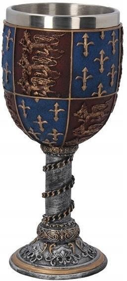 Kielich Króla — inspirowany średniowiecznym dworem Piękny i precyzyjnie wykonany kielich, wzorowany na naczyniach władców średniowiecznej Europy. Ozdobiony herbami najznakomitszych królewskich rodów, wspaniale prezentuje się na każdym stole. Dzięki wyjmowanemu metalowemu wkładowi, jest praktyczny i łatwy w czyszczeniu. Kielich Króla to wyjątkowa ozdoba dla każdego miłośnika historii i stylu średniowiecznego. Jego elegancka forma, bogato zdobiona królewskimi herbami, przyciąga wzrok i nadaje wyjątkowy charakter każdej okazji. Solidna konstrukcja i wysoka jakość wykonania sprawiają, że kielich jest nie tylko piękny, ale także praktyczny. Metalowy wkład można bez trudu wyjąć, aby dokładnie go umyć, co zapewnia wygodne użytkowanie i długowieczność produktu. Dzięki pojemności 200 ml kielich sprawdzi się zarówno do wina, jak i innych trunków. Nawet najzwyklejsze napoje podane w tak dostojnym naczyniu zyskują wyjątkowy smak i uroczystą oprawę. To doskonały pomysł na prezent dla osoby ceniącej oryginalne dodatki, pasjonata historii lub kogoś o królewskich manierach. Dlaczego warto? Starannie odwzorowany wzór inspirowany średniowieczem Wyjątkowy design z królewskimi herbami Wyjmowany wkład ze stali nierdzewnej — łatwe czyszczenie Doskonały na prezent lub jako ozdoba stołu Specyfikacja techniczna Nazwa: Kielich Króla Wysokość: 17,5 cm Pojemność: 200 ml Materiał: stal nierdzewna, poliżywica Metalowe wnętrze wyjmowane do mycia FAQ Czy kielich nadaje się do picia gorących napojów?Nie zalecamy używania kielicha do bardzo gorących napojów, ponieważ metalowe wnętrze szybko się nagrzewa. Czy kielich można myć w zmywarce?Nie, zalecane jest mycie ręczne, aby zachować zdobienia w doskonałym stanie. Z jakich materiałów wykonano kielich?Wnętrze wykonane jest ze stali nierdzewnej, a zewnętrzna część z trwałej poliżywicy z ręcznie malowanymi detalami. Czy kielich jest ciężki?Kielich ma solidną konstrukcję, ale jest poręczny i wygodny w trzymaniu.