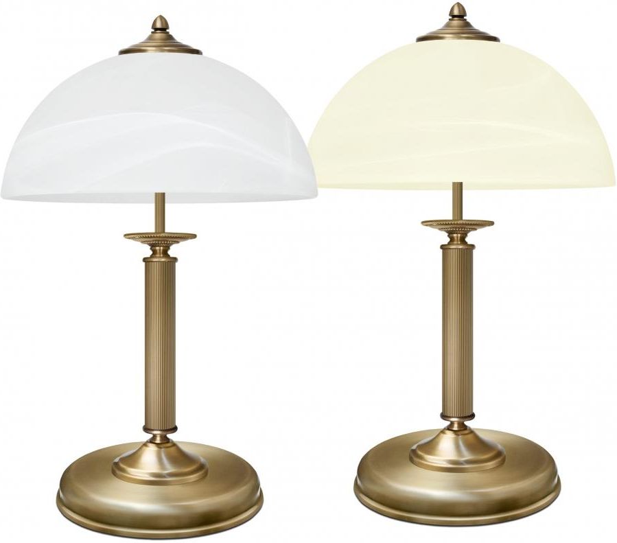 Lampa mosiężna gabinetowa. - Wykonana w całości z elementów z pełnego mosiądzu. Mosiądz to trwały, szlachetny i ponadczasowy materiał - kliknij, aby dowiedzieć się więcej. - Wykończenie mosiądzu: złota patyna.- Włącznik na przewodzie zasilającym. W innych lampach z Serii V oferujemy dwie podobne lampy: pierwsza włączana jest przyciskiem na podstawie lampy (symbol V-B2-P), a druga wyłącznikiem łańcuszkowym (symbol V-B2-L). - Klosz szklany do wyboru: biały ‘alabaster’ lub ecru ‘alabaster’ (albo na zamówienie ecru gładki w zależności od dostępności). - Wymiary całkowite: wysokość 49cm, średnica klosza 30cm. - W podstawie lampy umieszczony jest odważnik zapewniający jej stabilność.- Żródło światła: 2xE14 (żarówki tradycyjne/żarowe o mocy max. 40W) lub żarówki energooszczędne albo LED o większej mocy (np. 80W).Lampa jest fabrycznie nowa, wyprodukowana w Polsce. Gwarancja: 24 miesiące. Seria V - zobacz wszystkie lampy