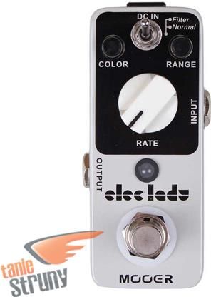 Mooer E-LadyPedał efektu flanger Klasyczne analogowe brzmienie flangera z efektem filtra i oscylatora 2 tryby (normalny/filtr) Metalowa obudowa True bypass Wejście/wyjście: mono jack, 6,3 mm Zasilanie: opcjonalny zasilacz 9V DC Wymiary: 93,5 mm (dł.) × 42 mm (szer.) × 52 mm (wys.)Waga: 160 g Nr …