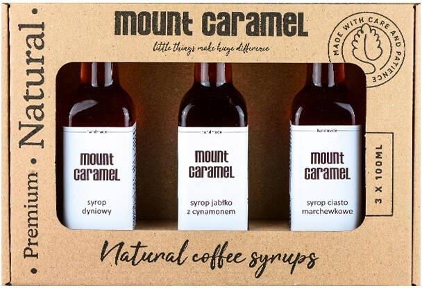 Zestaw syropów Mount Caramel stworzony z myślą o miłośnikach kawy, herbaty i słodkich deserów, pragnących dodać swoim specjałom wyjątkowego smaku i charakteru. Zestaw jest zapakowany w kartonik prezentowy i zawiera trzy smaki: dynia, ciasto marchewkowe oraz jabłko z cynamonem, każdy zamknięty w 100ml szklanej buteleczce. Zestaw zawiera syropy: -Dynia - Składniki: karmelizowany cukier, woda, świeży sok z cytryny, ekstrakt z dyni, cynamon, imbir. -Ciasto marchewkowe - Składniki: karmelizowany cukier, woda, ekstrakt z marchewki, cynamon, kardamon, świeży sok cytrynowy. -Jabłko z cynamonem - Składniki: karmelizowany cukier, woda, ekstrakt z marchewki, cynamon, kardamon, świeży sok cytrynowy.