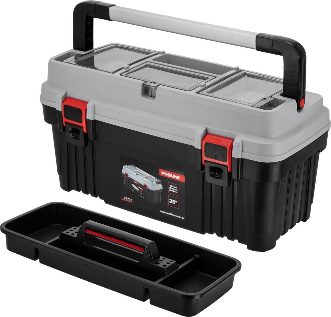 Skrzynka narzędziowa z 2 klamrami 25 cali 586x296x305 tacka Proline 35775 Skrzynka narzędziowa Proline 35775 25 cali (586x296x305 mm) to przestronna i trwała opcja dla każdego majsterkowicza i profesjonalisty. Została wykonana z wysokiej jakości wytrzymałej mieszanki polimerów, co zapewnia odporność na uszkodzenia mechaniczne i intensywne użytkowanie, idealna do pracy zarówno w domu, jak i w warsztacie. Pokrywa wyposażona jest w dwa praktyczne organizery, które umożliwiają szybki dostęp do drobnych elementów, takich jak śruby czy nakrętki, bez potrzeby otwierania całej skrzynki. Wewnątrz znajduje się wygodna tacka z uchwytem, która ułatwia organizację narzędzi i pozwala szybko znaleźć potrzebne akcesoria. Dzięki dwóm solidnym klamrom z tworzywa ABS, skrzynka zamyka się bezpiecznie, chroniąc zawartość przed przypadkowym wysypaniem. Ergonomiczny uchwyt sprawia, że skrzynka jest łatwa i komfortowa w transporcie. To uniwersalne i pojemne rozwiązanie do przechowywania zarówno większych narzędzi, jak i drobnych akcesoriów. Kod produktu: 35775 EAN: 5903755357755
