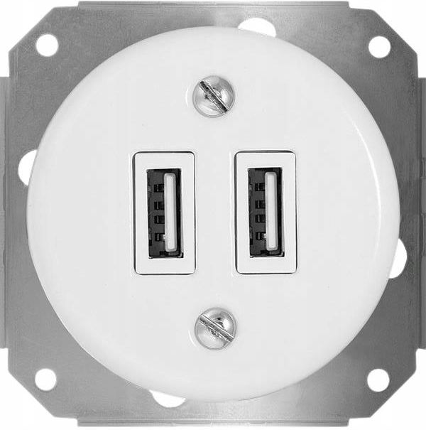 Gniazdo USB podwójne 3.2A Retro ceramic bez ramki - białe Gniazdo z dwoma portami USB-A DC 5V/2A. Porty USB umożliwiają ładowanie telefonu, powerbanku oraz służą do zasilenia innych urządzeń kompatybilnych z tym interfejsem. Przeznaczone jest do montażu w puszcze podtynkowej głębokiej, o średnicy …