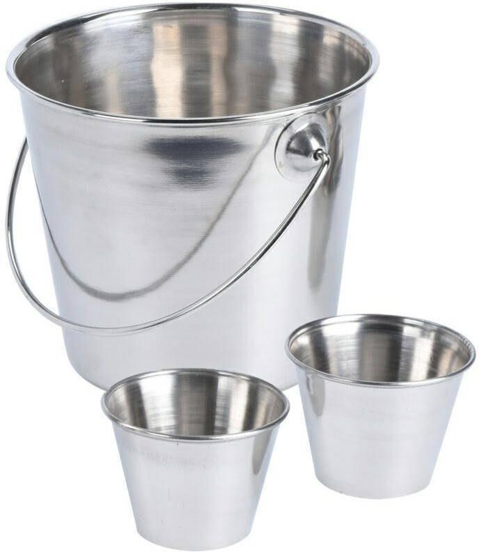 Wiaderko na frytki, przystawki, przekąski, + 2x miseczka na sosy, dipy Zestaw do podawania przekąsek oraz przystawek. Szczególnie polecane do serwowania frytek. W komplecie wiaderko oraz dwa pojemniki na sosy. Wiaderko wyposażone w wygodny uchwyt ułatwiający przenoszenie. Zestaw w całości wykonany ze stali nierdzewnej. Polecany do użytku domowego oraz lokali gastronomicznych. Wiaderko ma średnicę 11,5 cm oraz wysokość 11 cm. Miseczki mają średnicę 6 cm oraz wysokość 4,5 cm. Specyfikacja: Materiał: stal nierdzewna Długość: 11,5 cm Szerokość: 11,5 cm Wysokość: 11 cm Waga (g): 130 Kolor dominujący: srebrny