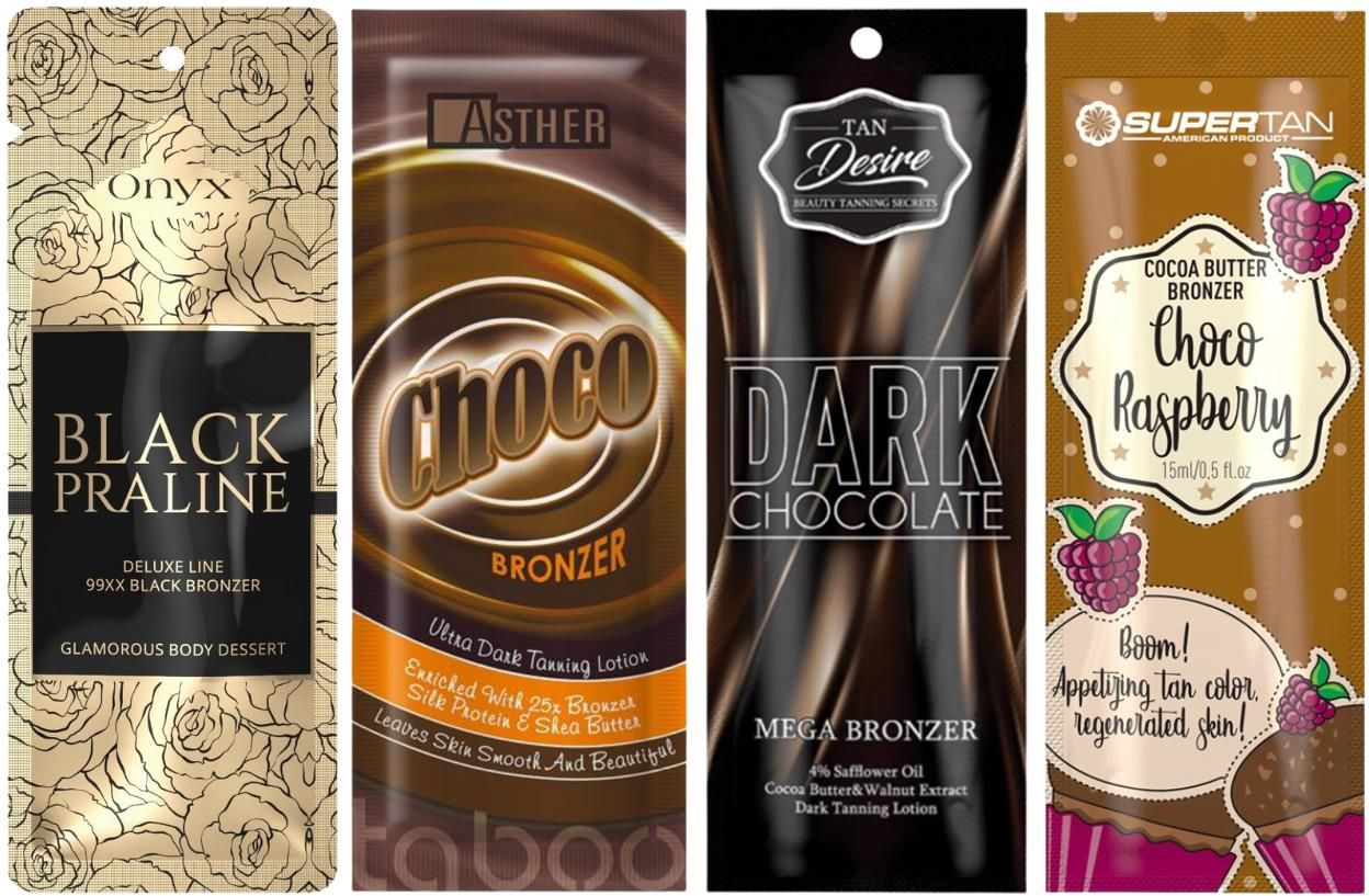 Zestaw Czekoladowych Bronzerów 4 Rodzaje po 2sztOnyx Black Praline Intensywnie Brązujący Balsam 15mlŻycie to pudełko czekoladek… Dlatego daj się uwieść bronzerowi Black Praline, który jest kwintesencją deserowej przyjemności i sposobem na piękną czekoladową opaleniznę.Wzbogacona o ChocoTan Blend – kompozycję z ekstraktem ze skorupki orzecha włoskiego, pomarańczy i erytrulozy – Black Praline gwarantuje osiągnięcie ciemnej opalenizny.Dodatkowo pielęgnujący skórę olej arganowy i masło shea pozostawiają uczucie głębokiego nawilżenia i odżywienia.Asther Choco Bronzer Czekoladowy Do Opalania 15mlIntensywnie działający bronzer przeznaczony dla osób o ciemnej karnacji i już opalonychMasło shea, aloes, hibiskus, nagietek zapewniają działanie przeciwpoparzeniowe, przeciwzapalne i wygładzająceKosmetyk jest ciemny mocnym kosmetykiem do opalania - również do opalania na słońcuGłębokie nawilżanie poprzez zastosowanie formuły AquaComfort w połączeniu z prowitaminą B5 i proteinami jedwabiuTan Desire Dark Chocolate Mega Ciemny Bronzer 15mlMocna czekolada bez grama kalorii?Teraz to możliwe dzięki mega bronzerowi z efektem WOW!Silnie brązujący skórę produkt z wysoką zawartością DHA zapewnia efekt natychmiastowej opalenizny, natomiast wysoka dawka ekskluzywnego oleju szafranowego zapewnia pielęgnację, regenerację i odżywienie skóry na najwyższym poziomie.Całość wzbogacona w olej kokosowy i masło kakaowe tworzy mieszankę doskonałą.Supertan Choco Raspberry Bronzer Kakaowy 15mlSpełnij pragnienie o posiadaniu skóry w odcieniu czekoladowego brązu, jak mieszkańcy tropikalnych wysp. I niech pytają: „Skąd wróciłaś?” Umiemy stworzyć iluzję wakacji. Nadać ciału brązowy odcień relaksu i wypoczynku. Tajemnica formuły, to umiejętne dobranie składników brązujących i przyspieszających opalanie jak DHA, ekstrakt z łupiny orzecha włoskiego, tyrozyna oraz karmel i dodanie ich w odpowiednich proporcjach. To zapewnienie skórze intensywnej, odżywczej pielęgnacji podczas opalania za sprawą masła Shea i kakowego oraz zminimalizowanie uszkodzeń dzięki witaminie E. Odkryj słodycz opalania i radość ze zmysłowego zapachu czekolady z malinami, z ciemnego odcienia brązu i intensywnej regeneracji skóry.Zapach: raspberry chocolate