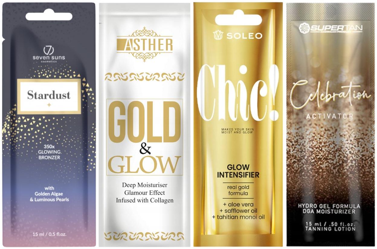 Zestaw Przyspieszaczy Do Opalania 4 Rodzaje x2szt7suns Stardust Bronzer Rozświetlający 15mlLśnij każdego dnia! Rozświetlający bronzer Stardust pełen połyskujących drobinek, to maksimum głębokiego brązu i niezwykły blask, który jeszcze bardziej podkreśli spektakularną opaleniznę. Stardust to po prostu gwiezdna poświata na wyciągnięcie dłoni.Asther Gold&Glow Balsam Do Opalania 15mlTo balsam zdecydowanie aktywujący proces opalania!Zawartość kolagenu sprawia, że skóra staje się jedwabiście gładka i elastycznaKolagen opóźnia procesy starzenia się oraz przywraca skórze zdrowy, młodzieńczy wygląd i blaskDziałanie zapewnia wysoki stopień nawilżenia poprzez zastosowanie wyciągów roślinnych, poprawiających napięcie skórySoleo Chic! Przyspieszacz Z Drobinkami 15mlChic! Silnie nawilżający przyspieszacz opalania z drobinkami złota. Idealny do twarzy i ciała.Wyjątkowa formuła zapewnia szybki efekt opalonego ciała.Chic! Zakochasz się w pięknej, opalonej i pełnej blasku skórze.Składniki aktywne: tyrozyna, drobinki złota, aloes, olej szafranowy, olej Tahitian MonoiSupertan Celebration Przyspieszacz 15mlPrzeżyj niezapomniane chwile z aktywatorem opalania Celebration!Unikalna, żelowa formuła wchłania się błyskawicznie i zapewnia idealną opaleniznę Twojej skórze. Doskonale skomponowane aktywne składniki nawilżające gwarantują jej atrakcyjny wygląd i młodzieńczy blask. Gładka skóra i szampański zapach uwodzą zmysły długo po opalaniu.