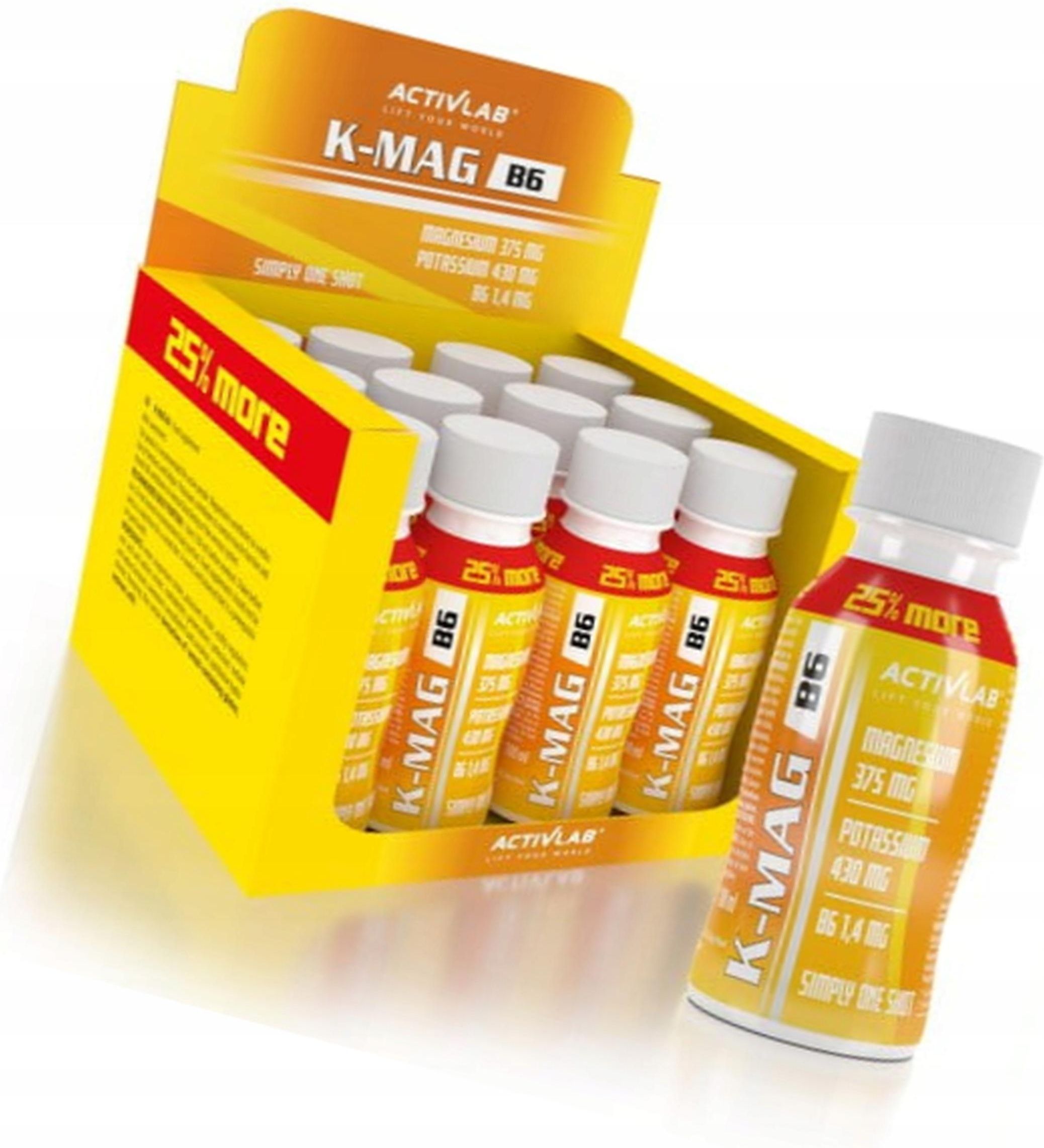 ACTIVLAB K-MAG B6 SHOT 80ml BOX 12szt MAGNEZ POTAS 25% WIĘCEJ!!! Opis Produktu K-MAG B6 marki Activlab to produkt, zawierający skoncentrowane źródło magnezu (375 mg) oraz potasu (430 mg), wzbogacony o witaminę B6. Magnez przyczynia się do zmniejszenia uczucia zmęczenia i znużenia. Potas pomaga w prawidłowym funkcjonowaniu mięśni, a witamina B6 w prawidłowym funkcjonowaniu układu nerwowego. K-MAG B6 Activlab to zastrzyk energii podczas treningu, koncentracja i skupienie na najwyższym poziomie. Skład: Porcja: 80ml Ilość porcji w opakowaniu: 12 Zawartość w 1 porcji: Magnez 375 mg (100%*) Potas 430 mg (22%*) Witamina B6 1,4 mg (100%*) * - % referencyjna wartość spożycia Zalecane spożycie: 1 shot o pojemności 80 ml przed treningiem. Przed użyciem wstrząsnąć. Najważniejsze fakty: Wygodna, łatwo przyswajalna formuła w płynie Zapewnia pokrycie niedoboru magnezu, potasu, witaminy B6 Zapobiega skurczom, redukuje zmęczenie