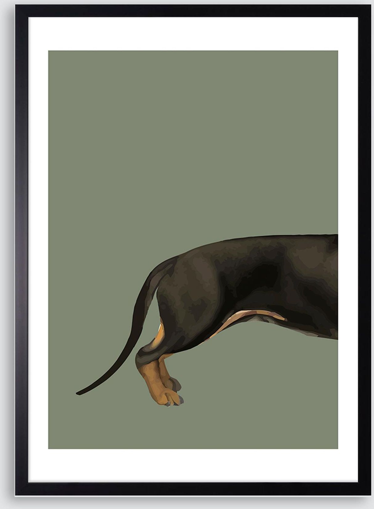 Chcesz ozdobić mieszkanie nietuzinkową dekoracją? Obraz DASCHUND I przedstawia ogon i łapki jamnika na oliwkowym tle. Czarna rama jest wykonana z lekkiego i trwałego polistyrenu. Z łatwością zawiesisz obraz. Wymiary obrazu: 50x70 cm. Wymiary obrazu z ramą: 53x73 cm. Pomóż pieskowi znaleźć swoją drugą połówkę – dobierz z kolekcji obraz DASCHUND II .
