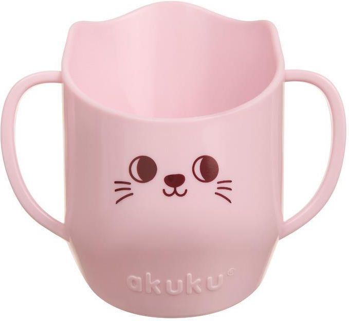 Kubek z uchwytami dla dzieci do nauki samodzielnego picia to bez wątpienia wspaniała zachęta do picia wody oraz innych napojów i wyrabiania prawidłowych nawyków. Jest lekki i poręczny, zaprojektowany idealnie do dziecięcych dłoni. Dzieci podpatrując dorosłych chcą korzystać z podobnych naczyń, dlatego nasz kubek to świetne rozwiązanie. Ścięta krawędź kubka ułatwia dziecku picie, dzięki czemu nie musi ono odchylać głowy do tyłu, co zmniejsza ryzyko zakrztuszenia. Kubek jest wykonany z nietłukącego się i bezpiecznego plastiku, nie zawiera BPA ani innych szkodliwych substancji. Jest wytrzymały, lekki i odporny na uszkodzenia. Można go myć go w zmywarce. Przeznaczony do napojów zimnych lub w temperaturze pokojowej. Rekomendowany dla dzieci od 6 miesiąca życia. Główne zalety: picie w bezpiecznej pozycji – idealny do nauki samodzielnego picia; wycięta i wyprofilowana krawędź boczna umożliwia picie bez odchylania głowy do tyłu, co pomaga zmniejszyć ryzyko zadławienia; szerokie uchwyty ułatwiają dziecku wygodne trzymanie; można myć w zmywarce (maks. temp. 60°C); wyprodukowany bez BPA, PCV, ftalanów i innych szkodliwych substancji. Instrukcja użytkowania: Kubek utrzymuj w czystości. Przed pierwszym użyciem wyczyść produkt, a następnie umieść we wrzącej wodzie na 5 min. Ma to na celu zapewnienie higieny. Gotowanie oraz twarda woda może spowodować powstawanie osadu. Czyścić dokładnie przed każdym użyciem, aby zapewnić higienę. Przed pierwszym i każdym kolejnym użyciem umyj kubek w ciepłej wodzie z delikatnym środkiem myjącym, dokładnie wypłucz ciepłą wodą. Polej wrzątkiem. Unikaj szorstkich, rysujących powierzchnię narzędzi. Po użyciu kubek oczyść z resztek napoju, wypłucz a następnie dokładnie umyj. Wyrób sprawdź przed każdym użyciem. W przypadku pierwszych oznak zniszczenia lub zużycia wyrzuć. Produkt można myć w zmywarce. Nie zalecamy podgrzewania w kuchence mikrofalowej. Produktu nie należy umieszczać w nagrzanym piekarniku ani ogrzewać na kuchence gazowej bądź elektrycznej. Nie zostawiać kubka w miejscu nasłonecznionym lub gorącym, ponieważ może to spowodować osłabienie produktu. Uwaga! Produkt nie jest zabawką. Ostrzeżenia: Ciągłe i przedłużone ssanie płynów może powodować próchnicę. Zawsze sprawdzać temperaturę pokarmu przed karmieniem. Wyrzucić przy pierwszych oznakach uszkodzenia lub zużycia. Nieużywanie części przechowywać w miejscu niedostępnym dla dzieci. Nigdy nie przypinać do sznurków, wstążek, koronek ani luźnych części ubrania. Dziecko może się udusić.