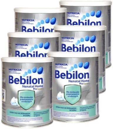 Bebilon Nenatal Premium Zestaw 6x400g Właściwości: Bebilon Nenatal Home to dietetyczny środek spożywczy specjalnego przeznaczenia medycznego, przeznaczony do postępowania dietetycznego u niemowląt przedwcześnie urodzonych i niemowląt, które przyszły na świat z małą i bardzo małą urodzeniową masą ciała, a wypisywane są ze szpitala z masą ciała zbyt małą w stosunku do wieku postkoncepcyjnego (1800 - 2500 g) i nie są karmione piersią. Skład: laktoza z mleka, oleje roślinne (słonecznikowy, kokosowy, rzepakowy, palmowy, z wiesiołka, z organizmów jed- nokomórkowych), odtłuszczone mleko w proszku, koncentrat białek serwatki z mleka, syrop glukozowy w prosz- ku, galaktooligosacharydy z mleka 7,85%, trójglicerydy średniołańcuchowe (MCT), tłuszcze zwierzęce (lipidy jaja kurzego, olej rybi), fruktooligosacharydy 0,55%, węglan wapnia, fosforan wapnia, cytrynian potasu, chlo- rek sodu, wodorofosforan magnezu, inozytol, kwas L-askorbinowy, chlorek choliny, lecytyna sojowa, tauryna, siarczan żelazawy, octan DL-alfa-tokoferolu, siarczan cynku, 5’-monofosforan cytydyny, nikotynamid, sól sodowa 5’-monofosforanu urydyny, sól sodowa 5’-monofosforanu inozyny, D-pantotenian wapnia, L-karnityna, 5’-monofosforan adenozyny, octan retinylu, sól sodowa 5’-monofosforanu guanozyny, siarczan miedzi, palmitynian retinylu, DL-alfa-tokoferol, chlorowodorek tiaminy, chlorowodorek pirydoksyny, cholekalcyferol, cyjanokobalamina, ryboflawina, kwas foliowy, jodek potasu, siarczan manganu, fitomenadion, selenin sodu, D-biotyna.