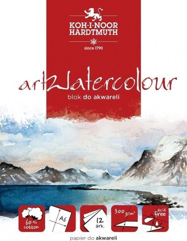 Blok akwarelowy artwatercolour A6 12 kartek 300G. Producent: Koh-I-Noor Kod paskowy (EAN): 5902927314916 Blok Art Watercolour został wyprodukowany z najwyższej jakości papieru, zawierającego 60 % włókien bawełny oraz certyfikowane włókna celulozy. Papier ma odcień naturalnej bieli, jest fakturowany, bardzo wytrzymały i odporny, nie zawiera w składzie metali ciężkich ani kwasu. Posiada naturalne PH. Doskonale nadaje się do malowania farbami akwarelowymi, nie marszczy się i idealnie odzwierciedla kolory.