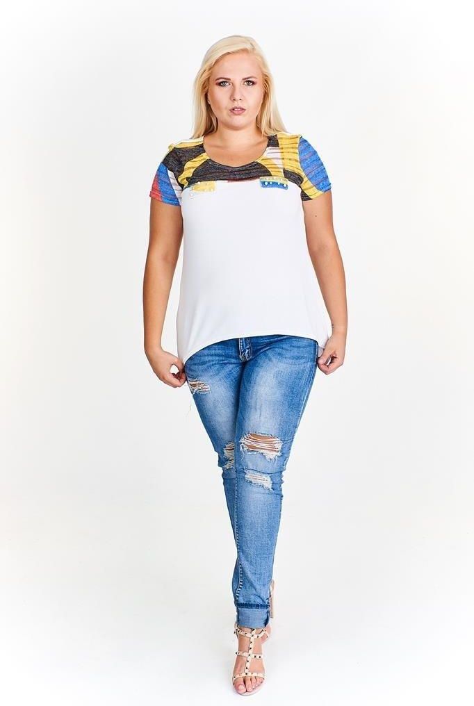Bluzka z dzianiny gładkiej, ze wstawkami z dzianiny swetrowej. Krótkie rękawy oraz karczek z przodu: z cienkiej, prześwitującej dzianiny swetrowej. W miejscach prześwitów (prześwity w formie poziomych pasów) delikatnie połyskujące nitki. Dodatkowo poniżej karczka patki, z tej samej dzianiny swetrowej a na nich ozdobne perełki. Bluzka luźna, na bokach dłuższa. Tył gładki. Dekolt, doły rękawów, oraz dół bluzki wykończony dwuigłą. Dla kobiet w każdym wieku, na co dzień. Świetnie komponuje się z legginsami lub wąskimi spodniami. PRODUKT POLSKI Kupując polskie marki wspierasz rozwój rodaków. Polska rośnie w siłę.