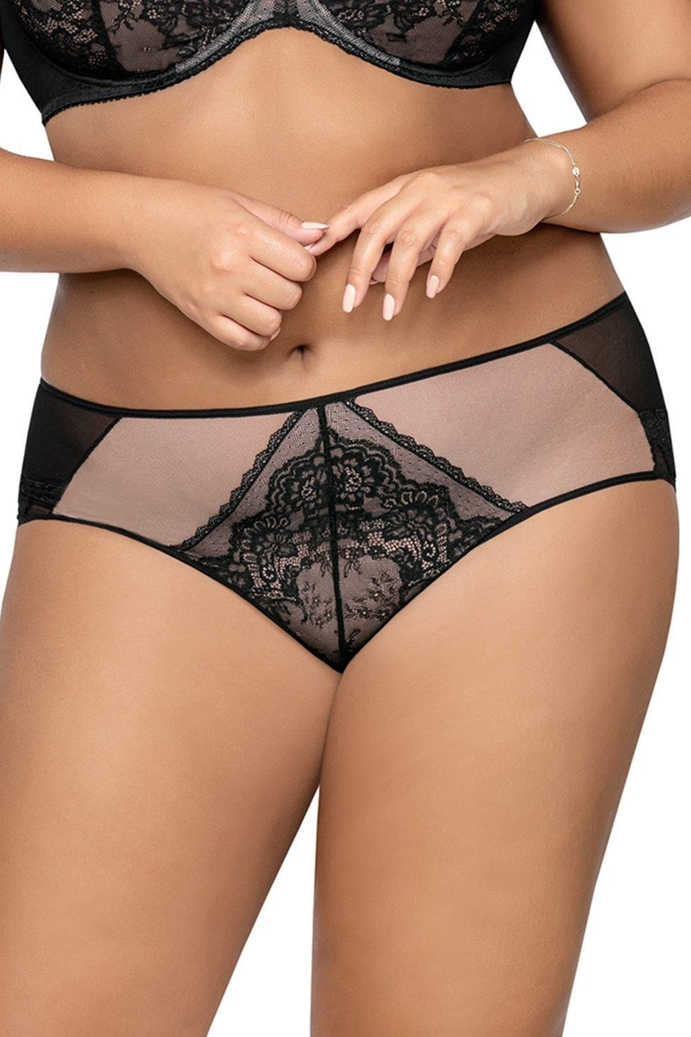 Pełne uroku klasyczne majtki typu brazyliany to idealne łączą w sobie elegancję z wygodą w codziennym użytkowaniu. Klasyczne damskie brazyliany wykonane z delikatnej siateczki w połączeniu z efektowną koronką o kwiatowym motywie. Koronka poprzecinana satynowymi taśmami i uzupełniona tiulem pozostawia wyobraźni to, co zostało delikatnie okryte kuszącymi przezroczystościami. Tył wykonany z gładkiej dzianiny. Do kompletu polecamy biustonosz1824. Skład: 91% poliamid, 5% bawełna, 4% elastan Typ: brazyliany Kolor: czarny