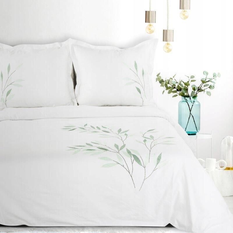 Biały komplet pościeli haftowanej od producenta Eurofirany to gwarancja doskonałej jakości materiału, gustownego wzornictwa i trwałości. Pościel uszyto z najwyższej jakości satyny bawełnianej, tkanina ma subtelny połysk, jest miękka, delikatna dla ciała i łatwa w użytkowaniu - mało się gniecie i łatwo prasuje. Komplet posiada subtelny haft w postaci zielonych gałązek.Biały kolor pościeli w połączeniu z subtelnym roślinnym wzorem, kojarzy się z nowoczesnością i wyrafinowaniem. Komplet doda elegancji każdemu wnętrzu. Pościel haftowana jakości PREMIUM może okazać się nie świetnym prezentem na różne okazje: rocznice, urodziny, śluby. W skład kompletu wchodzą: poszwa na kołdrę: 200 x 220 cm - 1 szt. poszewki na poduszki: 70 x 80 cm - 2 szt. Producent: Eurofirany Rozmiar poszwy na kołdrę: 200x220 cm Skład surowcowy: 100% satyna bawełna Sposób zapięcia: zamek błyskawiczny Kolor: biały, zielony Gramatura: 125 GSM