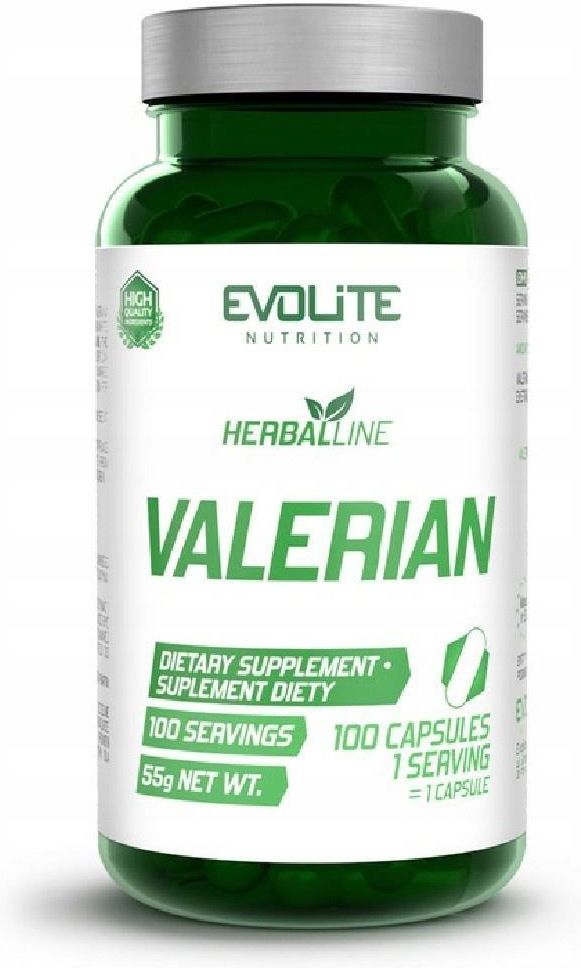 Evolite Nutrition Valerian 100 kapsułek Suplement diety w kapsułkach Składniki: Ekstrakt z korzeni kozłka lekarskiego (Valeriana Officinalis), Składniki kapsułki: żelatyna. biel tytanowa. Zalecana porcja do spożycia w ciągu dnia: Spożywać 1 kapsułkę raz dziennie. Suplement diety nie może być stosowany jako substytut (zamiennik) zróżnicowanej diety. Nie należy przekraczać zalecanej porcji do spożycia w ciągu dnia! Najlepiej spożyć przed (miesiąc/rok) i numer partii: Patrz na spodzie opakowania. Warunki przechowywania: Przechowywać szczelnie zamknięte, w suchym miejscu, w stałej i niskiej temperaturze. Chronić przed bezpośrednim działaniem promieni słonecznych. Przechowywać w sposób niedostępny dla małych dzieci! Masa Netto: 55g Składniki w porcji (1 kapsułka) Ekstrakt z Kozłka Lekarskiego (Valerian Extract) 450mg