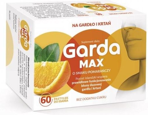 Garda MAX o smaku pomarańczy. Zawiera ekstrakt z porostu islandzkiego, który pomaga na suche gardło, krtań i struny głosowe, nawilżając błony śluzowe dróg oddechowych.