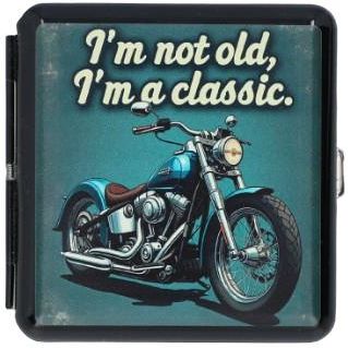 Papierośnica Gentelo "I’m not old, I’m a classic" z niebieskim motocyklem na tle retro-zieleni to hołd dla stylu i charakteru. Metalowa obudowa (9,5 x 9,5 x 1,6 cm) z gumkami wewnątrz zapewnia ochronę papierosów przed zgnieceniem, wilgocią i luzem w kieszeni. Dlaczego warto? Chroni papierosy- np. …