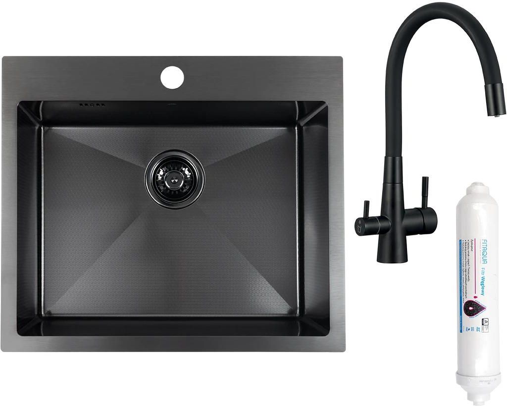 Zlewozmywak Jednokomorowy Malawi Honeycomb Z Syfonem I Baterią Filtrujacą Wodę Czarny Laveo Odkryj unikalne połączenie natury i nowoczesnego designu w Twojej kuchni z czarnym zlewem Malawi o strukturze Honeycomb i baterią Riveco! Zyskaj niepowtarzalny wygląd inspirowany plastrem miodu, który przyciąga wzrok i maskuje drobne zarysowania. Ciesz się elastycznością i komfortem użytkowania dzięki baterii Riveco z elastyczną wylewką i systemem filtracji wody. Wybierz łatwy montaż na równi z blatem lub wpuszczany i nadaj swojej kuchni wyjątkowy charakter! Zalety: Zachwyć się unikalną strukturą Honeycomb, która maskuje zarysowania i ułatwia czyszczenie. Ciesz się wygodą i precyzją użytkowania dzięki elastycznej wylewce baterii Riveco. Zapewnij sobie czystą wodę do picia i gotowania dzięki systemowi filtracji w baterii. Dopasuj montaż do swojej kuchni – wybierz nowoczesny montaż na równi z blatem lub elegancki montaż wpuszczany. Specyfikacja techniczna zlewozmywaka Szerokość: 500 mm. Długość: 580 mm. Głębokość: 200 mm. Do szafki: 600 mm. Odpływ: 3,5 cala. Model: 1 komora. Rodzaj korka: manualny. Syfon w zestawie: tak. Materiał: Stal nierdzewna z powierzchnią Honeycomb. Kolor: Czarny. Specyfikacja techniczna baterii Riveco Typ: Zlewozmywakowa, stojąca. Wylewka: Elastyczna. Funkcje dodatkowe: System do filtrowania wody. Kolor: Czarny. Najczęściej zadawane pytania ( FAQ ) Na czym polega unikalność powierzchni Honeycomb w tym zlewozmywaku? Powierzchnia Honeycomb, inspirowana strukturą plastra miodu, charakteryzuje się unikalnym wzorem, który skutecznie maskuje drobne zarysowania i plamy powstałe podczas codziennego użytkowania. Dodatkowo, ułatwia utrzymanie zlewu w czystości, sprawiając, że czyszczenie jest szybsze i prostsze. Czy bateria Riveco dołączona do zestawu posiada wszystkie niezbędne elementy do podłączenia filtra wody? Tak, bateria Riveco dołączona do zestawu jest wyposażona we wszystkie niezbędne przyłącza i wężyki, które umożliwiają podłączenie standardowego systemu do filtrowania wody. Należy jednak pamiętać, że sam filtr wody zazwyczaj nie jest częścią zestawu i należy go dokupić osobno. Czy montaż zlewozmywaka Malawi z powierzchnią Honeycomb jest trudny? Montaż zlewozmywaka Malawi z powierzchnią Honeycomb oferuje dwie opcje: na równi z blatem, co tworzy nowoczesną, jednolitą powierzchnię, oraz wpuszczany w blat, co zapewnia elegancki wygląd bez zbędnych zakamarków. Wybór zależy od preferowanego efektu wizualnego i rodzaju blatu. Obie metody montażu są stosunkowo proste, jednak w przypadku montażu wpuszczanego może być wymagana większa precyzja przy wycinaniu otworu w blacie. Czy czarny kolor zlewozmywaka i baterii Riveco jest łatwy w utrzymaniu czystości? Zarówno czarny kolor zlewozmywaka, jak i baterii Riveco są stosunkowo łatwe w utrzymaniu czystości. Regularne przecieranie miękką ściereczką z dodatkiem łagodnego detergentu pomoże usunąć bieżące zabrudzenia i osady. W przypadku trudniejszych plam można zastosować specjalne środki do czyszczenia stali nierdzewnej lub powierzchni matowych, pamiętając o dokładnym spłukaniu i wytarciu do sucha. Struktura Honeycomb może dodatkowo maskować drobne ślady użytkowania.