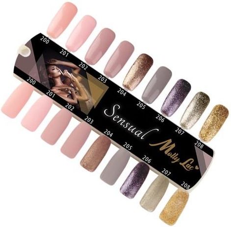 Wzornik MollyLac Sensual połysk i mat 9 Kolorów Molly Lac Sensual ponadczasowa, wyjątkowa kolekcja dla niezwykłych kobiet. 200 Chloe - Cudowny, mleczny odcień brzoskwini z nutą jasnego różu. Jeśli lubisz wyglądać zawsze dobrze niezależnie od sytuacji wybierz ten kolor - to niezwykle stonowany jednak ciekawy odcień dla każdej Kobiety. 201 Bella - Naturalny, jasno różowy odcień pudrowego różu, którego bez wątpienia nie można posądzić o to, że jest mdły! Lubi towarzystwo dodatków - jest doskonałą bazą do wszelkiego rodzaju zdobień! 202 Adele - Stonowany, wybitnie kobiecy kolor idealny na biznesowe spotkania. Kremowy odcień brudnego różu o ciepłej tonacji. Kolor, który zdecydowanie sprawdzi się zawsze i wszędzie. 203 Naomi - Kolor, który przywodzi na myśl ulotność dnia codziennego. Połączenie karmelowego beżu i różu to doskonałe i wybitnie ciekawe połączenie. Pozwól aby Twoje marzenia o cudownym manicure zapadły w pamięć! 204 Lexi - Dodaj wdzięczny akcent swojej stylizacji! Kolor, który na pewno zapadnie w Twojej pamięci! Delikatne, złote drobinki przenikające się z ciepłym, mlecznym odcieniem beżu. 205 Karen - Kolor, który idealnie wpisuje się w kanon klasycznej szarości na każdą okazję. Wysmakowany odcień, który doskonale połączy się ze wszelkimi odcieniami różu jak i kolorami brokatowymi. 206 Florence - Metaliczny, szary odcień zaklęty w srebrno fioletowo złotych drobinkach. Świetnie sprawdzi się na dłoniach Pań, które lubią dodać nieco blasku swoim stylizacjom! 207 Victoria - Cukierkowa słodycz zamknięta w klasycznym złocie. Niezwykły, błyszczący wabik, który możesz stosować jako dodatek lub jako podstawowy kolor całej stylizacji! Jasno złoty odcień drobnego brokatu, w którym z pewnością się zakochasz. 208 Aurelie - Biżuteryjny kolor z grubszym brokatem w kolorze cesarskiego złota. Duża ilość drobin skąpana w delikatnie bursztynowym transparentnym odcieniu.
