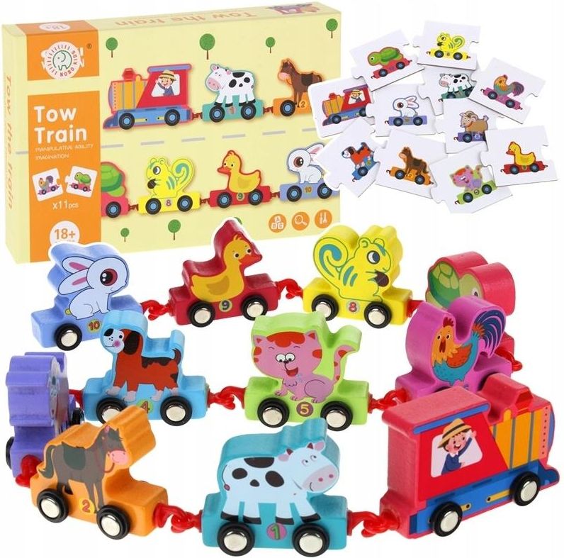 Drewniany Literkowy Pociąg Cyfry Cyferki Zwierzątka Układanka Puzzle Drewniana ciuchcia z wagonikami i lokomotywą ze zwierzątkami to doskonała zabawka dla najmłodszych. Do każdego wagoniku przypisana jest cyfra od 1 do 10, dzięki czemu dziecko może doskonalić naukę pierwszych cyferek, a także rozwijać swoją wyobraźnię, kreatywność czy też sprawność manualną. Koła pociągu są ruchome, a każdy z wagoników posiada plastikowe łączenie, które pozwoli dziecku wraz z maszynistą swobodnie planować najbardziej oddalone, pociągowe podróże po domu. W zestawie znajdują się również puzzle, które dziecko może połączyć niczym puzzelkowy pociąg z wizerunkami zwierzątek. Wielogodzinna, kreatywna zabawa gwarantowana. Zestaw zawiera: lokomotywę 10 wagoników 11 puzzli materiałowy woreczek do przechowywania Sugerowany minimalny wiek (według informacji podanej przez producenta na opakowaniu): 18 miesięcy+ Ilość elementów całego zestawu: 23 Wymiary lokomotywy: 10 (dł.) x 3 (szer.) x 5,5 (wys.) cm Wymiary wagonika: 8,5 (dł.) x 3 (szer.) x 5,5 (wys.) cm Długość całego zestawu: ok. 86,5 cm Wymiary opakowania: 28 (szer.) x 3,5 (gł.) x 18 (wys.) cm OSTRZEŻENIE! Nieodpowiednie dla dzieci w wieku poniżej 3 lat z uwagi na małe elementy i możliwość zadławienia oraz brak umiejętności dziecka do obsługi zabawki. Należy usunąć opakowanie przed podaniem zabawki dziecku. Opakowanie należy zachować, gdyż zawiera ważne informacje. Kolory i specyfikacja zawartości mogą się różnić od podanych na opakowaniu. Drewniana ciuchcia z wagonikami i lokomotywą ze zwierzątkami to doskonała zabawka dla najmłodszych. Do każdego wagoniku przypisana jest cyfra od 1 do 10, dzięki czemu dziecko może doskonalić naukę pierwszych cyferek, a także rozwijać swoją wyobraźnię, kreatywność czy też sprawność manualną. Koła pociągu są ruchome, a każdy z wagoników posiada plastikowe łączenie, które pozwoli dziecku wraz z maszynistą swobodnie planować najbardziej oddalone, pociągowe podróże po domu. W zestawie znajdują się również puzzle, które dziecko może połączyć niczym puzzelkowy pociąg z wizerunkami zwierzątek. Wielogodzinna, kreatywna zabawa gwarantowana. Zestaw zawiera: lokomotywę 10 wagoników 11 puzzli materiałowy woreczek do przechowywania Sugerowany minimalny wiek (według informacji podanej przez producenta na opakowaniu): 18 miesięcy+ Ilość elementów całego zestawu: 23 Wymiary lokomotywy: 10 (dł.) x 3 (szer.) x 5,5 (wys.) cm Wymiary wagonika: 8,5 (dł.) x 3 (szer.) x 5,5 (wys.) cm Długość całego zestawu: ok. 86,5 cm Wymiary opakowania: 28 (szer.) x 3,5 (gł.) x 18 (wys.) cm OSTRZEŻENIE! Nieodpowiednie dla dzieci w wieku poniżej 3 lat z uwagi na małe elementy i możliwość zadławienia oraz brak umiejętności dziecka do obsługi zabawki. Należy usunąć opakowanie przed podaniem zabawki dziecku. Opakowanie należy zachować, gdyż zawiera ważne informacje. Kolory i specyfikacja zawartości mogą się różnić od podanych na opakowaniu.