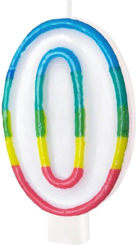 Świeczka urodzinowa cyferka zero "0" z kolorową obwódką. Wysokość: 8,5 cm. Opakowanie: 1 szt.