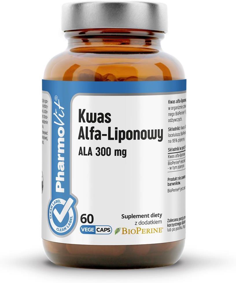 Kwas alfa-liponowy ala (300 mg) bezglutenowy 60 kapsułek - pharmovit (clean label) SKŁADNIKI Kwas alfa-liponowy; kapsułka celulozowa: hydroksypropylometyloceluloza; BioPerine®- ekstrakt z owoców pieprzu czarnego standaryzowany na 95 % piperyny. BioPerine® jest zastrzeżonym znakiem towarowym firmy SABINSA. Składniki w porcji dziennej - 2 kapsułki Kwas alfa-liponowy - 600 mg BioPerine® ekstrakt z owoców pieprzu czarnego (Piper nigrum) - 2 mg w tym piperyna - 1,9 mg OPIS Suplement diety. Kwas alfa-liponowy jest kwasem tłuszczowym naturalnie występującym w organizmie człowieka. Skład wzbogacony został ekstraktem z pieprzu czarnego BioPerine®. Piper nigrum wspiera trawienie i wchłanianie składników odżywczych. Produkt nie zawiera substancji wypełniajacych, przeciwzbrylajacych, barwników. ZALECANE SPOŻYCIE I INNE UWAGI Zalecana porcja produktu do spożycia w ciągu dnia niezbędna do uzyskania korzystnego działania produktu: Spożywać 1 kapsułkę 2 razy dziennie przed lub po posiłku. Popić wodą (250 ml). Zalecana porcja dzienna to 2 kapsułki. Nie należy przekraczać zalecanej porcji do spożycia w ciągu dnia. Nie stosować w przypadku uczulenia na którykolwiek ze składników. Produkt dla dorosłych. Nie stosować u dzieci, kobiet w ciąży i w trakcie laktacji. Produkt nie może być stosowany jako substytut zróżnicowanej diety. Ważne jest prowadzenie zdrowego trybu życia i zrównoważonego sposobu żywienia. ZALECANE WARUNKI PRZECHOWYWANIA Chronić przed światłem. Przechowywać w szczelnie zamkniętym opakowaniu, w temperaturze pokojowej, w suchym miejscu, w sposób niedostępny dla małych dzieci. WEGETARIAŃSKI:WEGETARIAŃSKIBEZ GLUTENU (deklaracja):BEZ GLUTENU (deklaracja)WEGAŃSKI:WEGAŃSKIBEZ GLUTENU (w składnikach):BEZ GLUTENU (w składnikach)BEZ CUKRU (w składnikach):BEZ CUKRU (w składnikach)PRODUCENT / DYSTRYBUTOR – NAZWA I ADRES:Pharmovit Dystrybucja Spółka z ograniczoną odpowiedzialnością, ul. Kostrogaj 9D, 09-400 Płock
