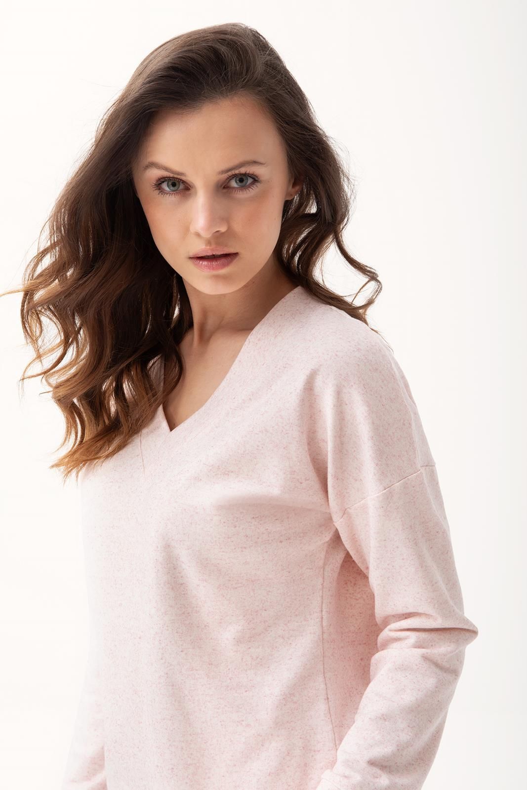 Ciepła piżama damska marki Luna składająca się z bluzki i spodni w kremowo-różowym kolorze. Wysoka jakość cieplejszej dzianiny, która posiada od spodu tzw. pętelki i gustowne wykończenie sprawiają, że całość prezentuje się bardzo estetycznie i kobieco. Bluzka posiada długie rękawy co zapewnia komfort cieplny. Dekolt w serek ładnie podkreśla szyję. Długie spodnie o prostych, nogawkach, zakończonych mankietem a'la ściągacz ładnie eksponują nogi i świetnie układają się na sylwetce. Dodatkowym atutem spodni są praktyczne kieszenie oraz kontrastowe wiązanie w pasie. Piżamka sprawdzi się nie tylko podczas nocnego wypoczynku, ale również jako wygodny strój domowy, tzw. homewear, w którym można swobodnie posnuć się po domu, wypić poranną kawę, czy pogawędzić przez telefon. Ta ciepła piżama idealnie sprawdzi się też na wszelkiego rodzaju wyjazdy, np. w góry, na narty, na ferie czy weekendowy wypad.Wielką zaletą piżamy jest jej skład, a więc piżamka, oprócz tego, że jest ciepła, to jest również "oddychająca". Skład: 60% bawełna, 35% poliester, 5% poliuretan Kolor: różowy PRODUKT POLSKI