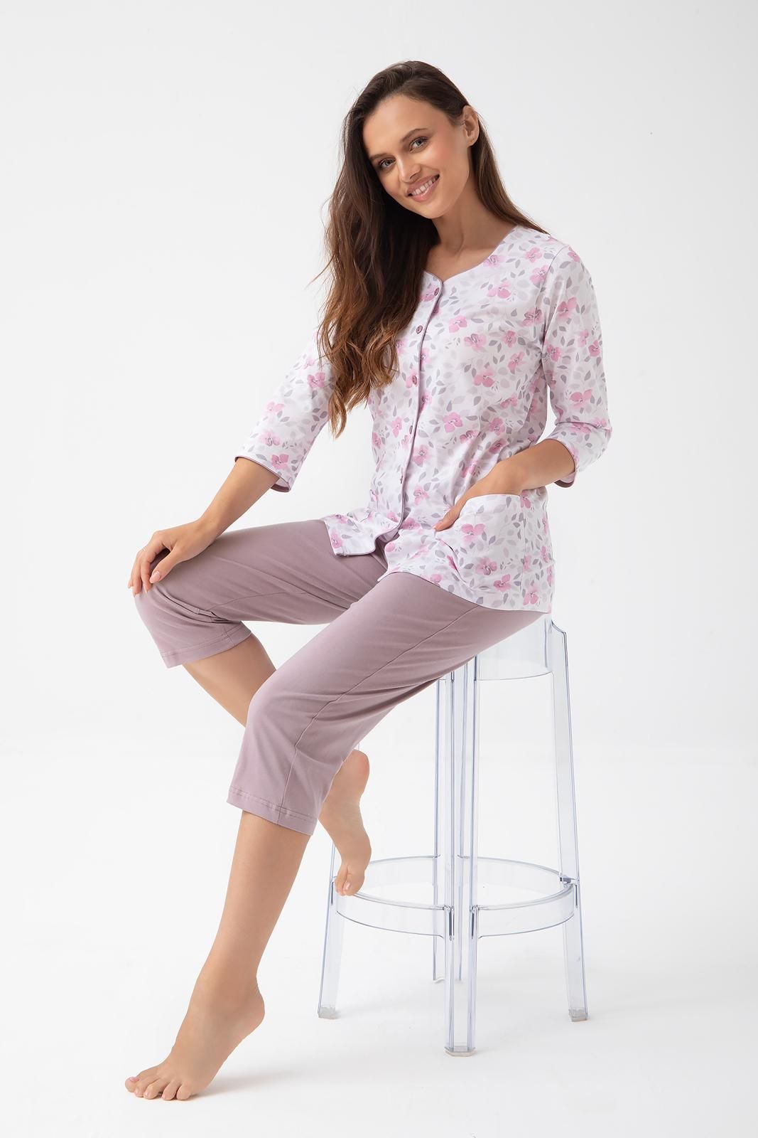 Bawełniana piżama damska w subtelny botaniczny wzór sprawdzi się jako strój nocny, nie tylko w domu, ale i na wyjazdach. Cenią ją sobie szczególnie panie na pobytach w sanatorium czy leczeniu w szpitalu. Uniwersalny krój zapewnia swobodę ruchów, sprawiając, że jest niezwykle wygodna w użytkowaniu. Zapięcie na guziki, pozwalające na rozpięcie na całej długości, to pewność komfortu nie tylko dla kobiet karmiących piersią. Przy dekolcie i zapięciu znajduje się zdobienie w kolorze kakaowym - wypustka, która nadaje całości elegancji. Rękawy o długości 3/4 wykończone są również kakaową wypustką. Piżama posiada praktyczne kieszenie. Kakaowe spodnie posiadają klasyczne nogawki o długości 3/4. Całość prezentuje się elegancko i jest bardzo komfortowa. Piżamę można zestawić z wieloma modelami szlafroków z naszej kolekcji. Skład: 100% bawełna Kolor: różowy, beżowy, kakaowy PRODUKT POLSKI
