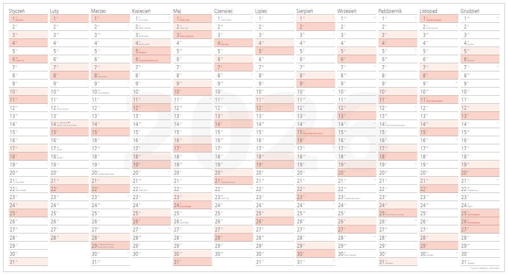 Planer ścienny na rok 2026 kalendarz MEGA 190x102cm ścieralny z samoprzylepnym mocowaniem i możliwością zmiany notatek dzięki pokryciu suchościeralnym laminatem Właściwości plannera na ścianę największy format szerokość 190 cm, wysokość 102 cm papier+ laminat suchościeralny zaznaczone dni wolne od pracy, święta państwowe i kościelne oraz zwyczajowe święta m.in. Dzień Babci i Dziadka, Dzień Kobiet, Dzień Matki, Dzień Dziecka. numerowane tygodnie; Masz możliwość wielokrotnej zmiany notatek jeśli użyjesz markerów suchościeralnych - po prostu zetrzyj je i napisz nowy tekst; jeśli nie chcesz zmieniać tekstu - pisz na kalendarzu foliopisem - markerem permanentnym, markery w wielu kolorach (także w kompletach z gąbką) znajdziesz na innych naszych aukcjach; Zaplanuj z naszym plannerem zmazywalnym wydarzenia domowe i firmowe, rozkłady zajęć szkolnych i akademickich, dostawy surowców, szkolenia i komferencje, zajęcia w klubach fitness (lub własny harmonogram ćwiczeń), wizyty pacjentów w gabinetach prywatnych i państwowych, zakładach fryzjerskich i kosmetycznych, Wielkość pola na notatki dla kalendarza rocznego MEGA to 14,7cm x 3,1cm Sposób mocowania planera - nie tylko na ścianie w komplecie z planerem otrzymujesz komplet 6 kółeczek ze specjalnej taśmy dwustronnie samoprzylepnej; zdejmij kółeczka z papieru podkładowego, naklej z tyłu planera, zdejmij różową folię ochronną przyklej kalendarz do dowolnej powierzchni np do ściany z dowolnym wykończeniem, drzwi, mebli lub tafli szkła. Duże stany magazynowe planerów rocznych mamy w stałej ofercie przez cały rok. Jeśli wolisz odebrać zakup osobiście - zapraszamy do siedziby naszej firmy produkcyjnej w urokliwym zakątku Polski przy DK12 wśród sosnowych lasów. W lewym dolnym rogu planera stopka producenta. Na innych naszych aukcjach znajdziesz różne formaty plannerów suchościeralnych: A1 - 84x59cm A0 - 119x84cm B0+ i B0 - 144x102cm i 138x97,5cm MEGA 190x102cm oraz planery szkolne, urlopowe, projektu i uniwersalne w różnych układach. Mamy w ofercie także planery magnetyczne i do wielokrotnego PRZYklejania i PRZEklejania.