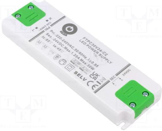 Zasilacz POS FTPC30V24-C2 to niezawodne źródło zasilania o mocy 30W, dostarczające stabilne napięcie 24V DC. Dzięki kompaktowej i płaskiej obudowie, idealnie nadaje się do zastosowań w systemach oświetleniowych LED oraz innych urządzeniach wymagających stałego napięcia 24V, zwłaszcza tam, gdzie przestrzeń montażowa jest ograniczona.