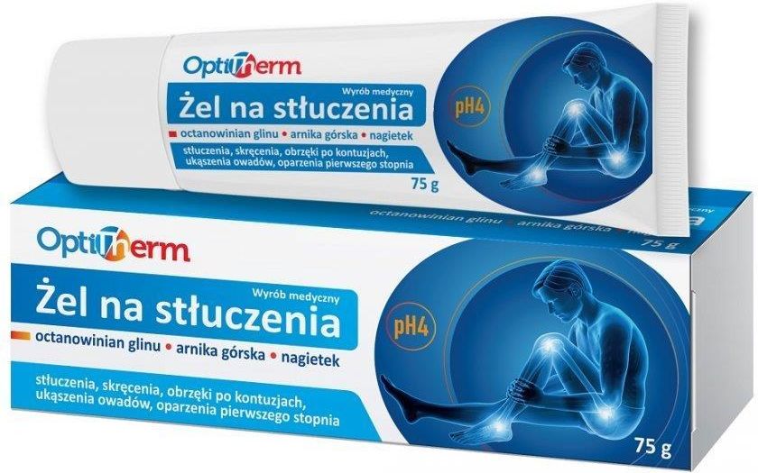 OptiTherm Żel na stłuczenia 75g OptiTherm Żel na stłuczenia jest przeznaczony do stosowania na skórę w celu złagodzenia takich objawów jak: obrzęki po stłuczeniach, skręceniach i ukąszeniach owadów oraz świąd i zaczerwienienie po oparzeniach pierwszego stopnia. Sposób użycia Niewielką ilość żelu wmasować w skórę. Stosować 3–4 razy na dobę. Do użytku zewnętrznego. Nie stosować na otwarte rany i u dzieci poniżej 3 lat. Chronić przed dziećmi. Unikać kontaktu z oczami. Skład: octanowinian glinu 10 mg/g, wyciąg z arniki górskiej 1%, wyciąg z nagietka lekarskiego 1%, mentol, etanol, woda, hydroksyetyloceluloza (HEC), fenoksyetanol, DMDM hydantoina. Nie zawiera parabenów. To jest wyrób medyczny. Używaj go zgodnie z instrukcją używania lub etykietą. Produkt zawiera DEKLARACJĘ ZGODNOŚCI UE wynikającą z przepisów dyrektyw Unii Europejskiej, które potwierdzają bezpieczeństwo i jakość produktu. Produkt jest zarejestrowany przez Urząd Rejestracji Produktów Leczniczych, Wyrobów Medycznych i Produktów Biobójczych jako WYRÓB MEDYCZNY i spełnia wynikające z tego bardzo rygorystyczne normy, gwarantuje bezpieczeństwo i jakość. Produkt zawiera etykietę oraz instrukcje w języku polskim. PRODUKT OZNAKOWANY ZNAKIEM CE