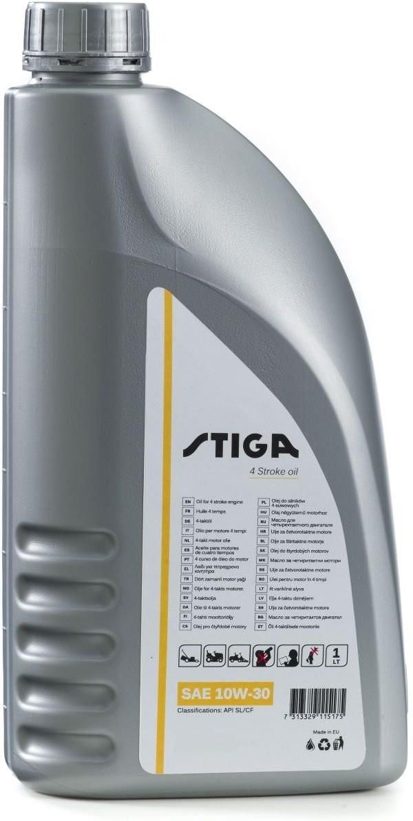 Stiga Olej SAE 10W30 1L Wysokiej jakości, wielosezonowy, syntetyczny olej do smarowania silników benzynowych chłodzonych powietrzem. Zalecany szczególnie do kosiarek samojezdnych (traktorów) oraz innych maszyn ogrodniczych, pracujących zarówno w warunkach letnich jak i zimowych. Klasa jakości oleju: API SL