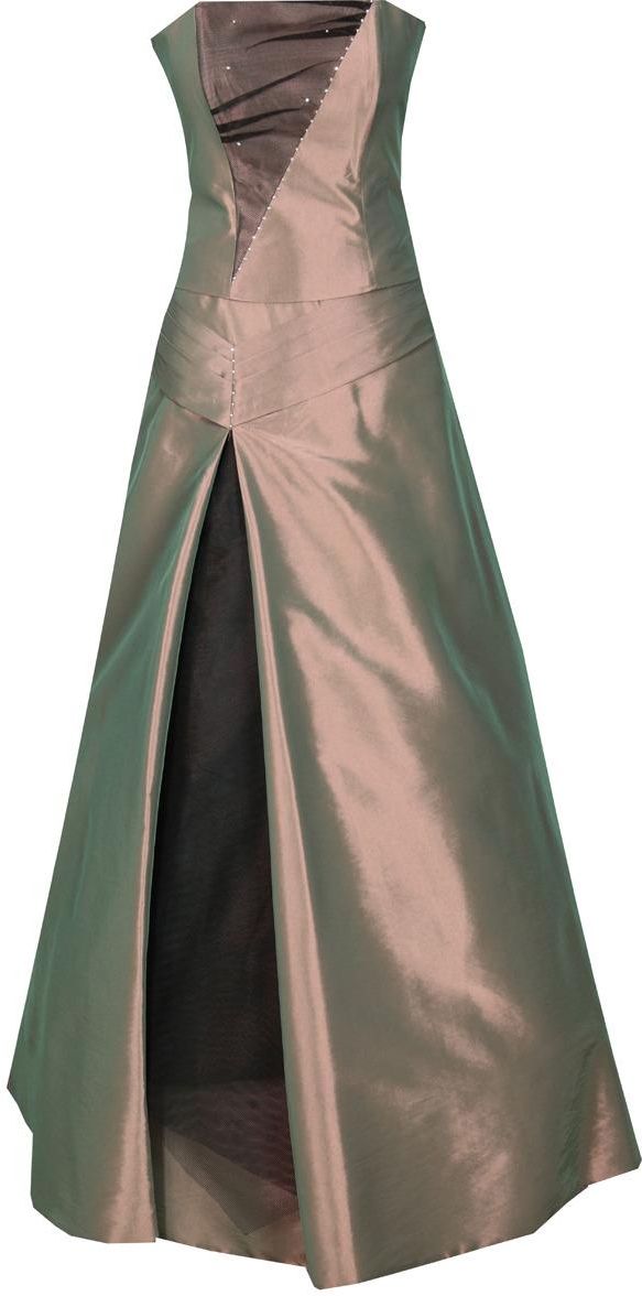 Fason: gorsetowa, rozkloszowana, halka stelaż Dekolt przód: gorsetowy Plecy: odkryte częściowo Zapięcie: sznurowanie z tyłu Materiał: tkanina - tafta, tiul Długość całkowita: maxi Rękaw: odkryte ramiona Ozdoby: dżety