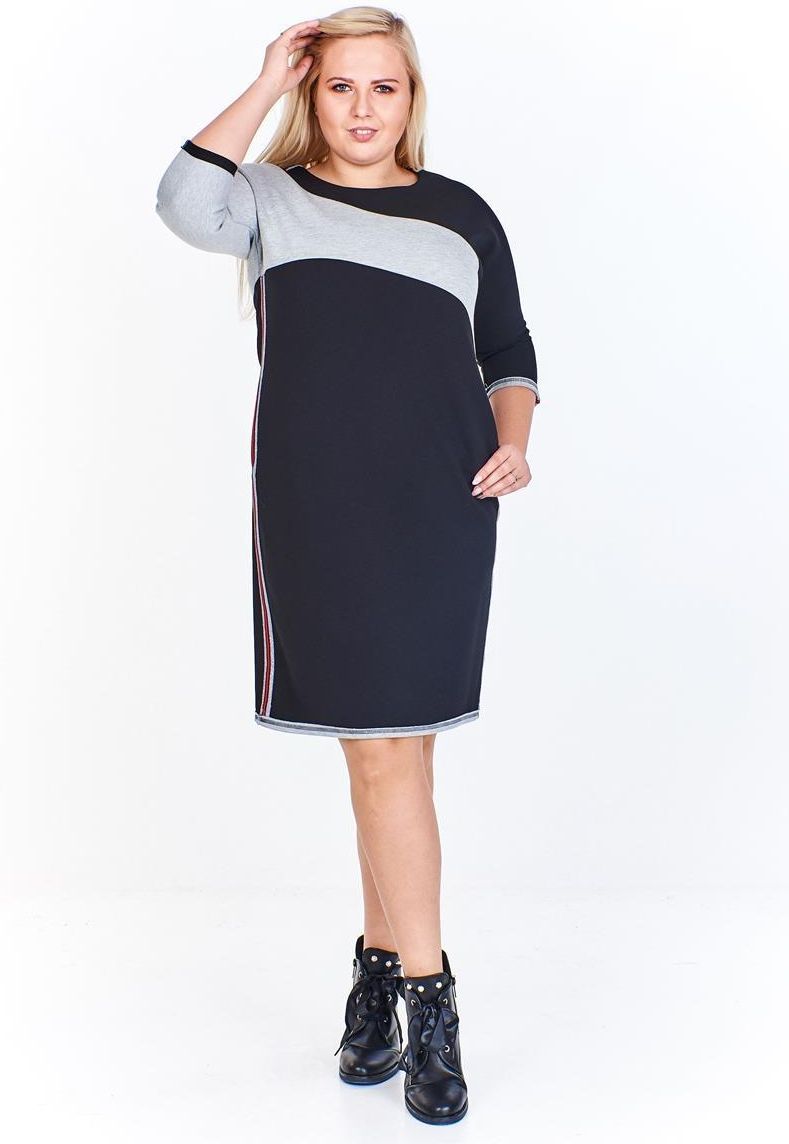 Dwukolorowa sukienka. Dekolt półokrągły. Rękaw 3/4 typu kimono. Sukienka dopasowana jest tylko w biodrach, od pasa w górę luźna. W szwach bocznych kontrastowe kieszenie, modny błyszczący lampas. Zarówno rękawy jak i dół sukienki zostały wykończone ozdobnym przeszyciem. Materiał użyty do produkcji jest dwustronny, Skład surowcowy: 50% bawełna, 45% poliester, 5% elastan. Bez podszewki. Bez suwaka. Sukienka codzienna, można ją wykorzystać zarówno w sportowych jak i bardziej szykownych stylizacjach. PRODUKT POLSKI kupując polskie marki wspierasz rozwój rodaków. Polska rośnie w siłę.