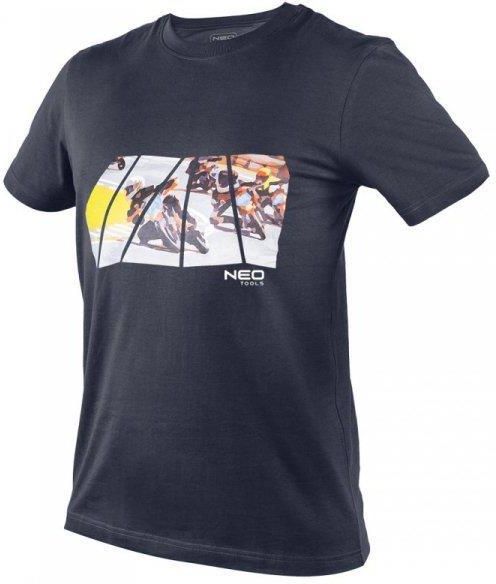 Kreatywny t-shirt z krótkim rękawem marki NEO TOOLS, łączący w sobie unikalny projekt własny z solidnym wykonaniem. Wykonany w 100% z miękkiej bawełny o gramaturze 180g/m2, ten niebieskoszary t-shirt gwarantuje nie tylko wygodę, ale również trwałość i łatwość w pielęgnacji. Jego unikalny charakter podkreśla nadruk na przodzie koszulki - grafika photoprintu przedstawiająca motocykle w ruchu, wkomponowane w kształty nieregularnych paneli, dodaje projektowi niepowtarzalnego wyglądu. T-shirt ten wyróżnia się nie tylko oryginalnością motywu, ale również sposobem wkomponowania drukowanego logo marki zarówno w nadruk na przodzie, jak i na karku koszulki, co świadczy o wysokiej dbałości o detale. Dodatkowo, okrągły dekolt wykończony elastyczną wypustką zapewnia komfort noszenia, a krótkie rękawy są idealne na cieplejsze dni. T-shirt NEO TOOLS jest nie tylko wyrazem indywidualnego stylu, ale również świadectwem wysokiej jakości. Dzięki swojemu unikalnemu projektowi własnemu, stanowi doskonały wybór dla osób ceniących oryginalność i komfort.