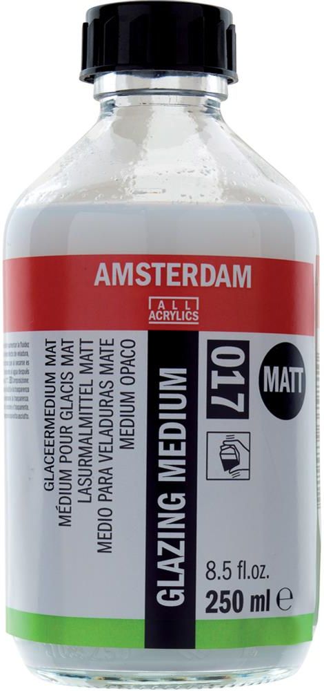 Medium do laserunku Amsterdam 250 ml - 017 matowe Medium akrylowe Amsterdam 017 matowe marki Royal Talens zmniejsza połysk, zwiększa płynność i przezroczystość warstwy laserunkowej farby akrylowej. Aby uzyskać optymalny efekt laserunku, należy mieszać z przezroczystymi kolorami. Medium ma kolor mlecznobiały, po wyschnięciu jest bezbarwny i przezroczysty. Delikatnie opóźnia schnięcie. Możliwość rozcieńczenia wodą. Po wyschnięciu wodoodporny. Wstrząsnąć przed użyciem. Stosować w temp. powyżej 10°C. Chronić przed mrozem. Matowe wykończenie nadaje, obecna w składzie, krzemionka.