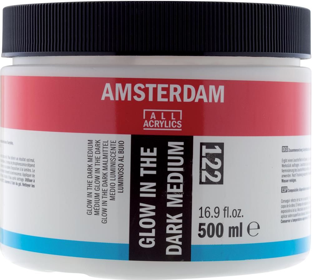 Talens Amsterdam Glow in Dark Medium Fosf 500ml. Talens Amsterdam Glow in the Dark Medium farba fosforyzująca do efektów świecenia w ciemności wykonana na bazie: dyspersyjna żywica akrylowa, pigment fosforescencyjny nakładać jako ostatnią warstwę w celu uzyskania optymalnego rezultatu czas …