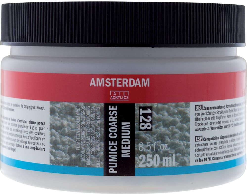 Pasta Amsterdam Royal Talens 128 PUMEKS Corse 250 ml Szara gruboziarnista pasta strukturalna Pumeks Medium Fine nada pracy szorstką teksturę. Można nakładać samą pastę, mieszać z farbą lub pomalować po nałożeniu. Odcień pasty wpływa na uzyskany kolor po zmieszaniu jej z farbą. Ziarnista konsystencja znacznie zwiększa osadzanie się koloru. Pumeks dostępny w trzech stopniach rozdrobnienia: drobnej, średniej i grubej. Drobny często jest stosowany do tworzenia tła. Pumeks jest używany do budowy modeli w małej skali - powierzchni takich jak np. beton, żwir, kamień. Nakładać w temperaturze powyżej 10°C. Chronić przed mrozem. Naczynia czyścić wodą. Cechy: można nakładać samą pastę lub mieszać z farbą akrylową można pomalować farbą akrylową wodoodporna po wyschnięciu odpowiednia do nakładania grubych warstw