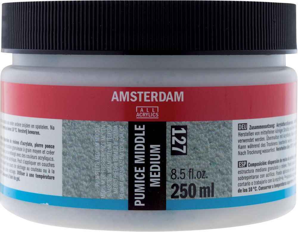 Talens Amsterdam Pumice Medium Pumeks Sred 250ml Talens Amsterdam Pumice Medium Middle do efektów średnie ziarno pumeksowe służy do tworzenia średniej struktury ziarna i reliefu skład: dyspersyjna żywica akrylowa, drobno zmielony pumeks możliwośc stosowania samodzielnie lub po zmieszaniu z farbą …