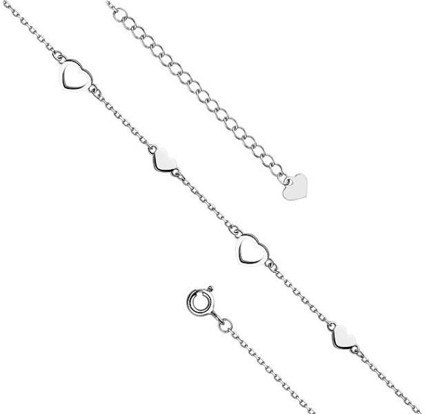 Delikatna rodowana srebrna bransoletka na nogę wykonana z łańcuszka o splocie ankier, zdobiona gładkimi polerowanymi na wysoki połsk dwoma pustymi i dwoma pełnymi serduszkami, model Z1660X.