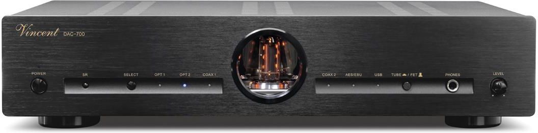Przetwornik cyfrowo/analogowy (DAC) Vincent DAC-700 DAC-700 to przetwornik cyfrowo-analogowy dla najbardziej wymagających. Oferuje sześć wejść cyfrowych, przyjmujących sygnał o rozdzielczości do 32 bitów, a także obsługę plików DSD. Sekcja analogowa jest w pełni zbalansowana i ma lampowy stopień wyjściowy. Wraz z DAC-700 przedstawiamy całkowicie nowy przetwornik cyfrowo-analogowy. W porównaniu do swojego poprzednika, DAC-7, sekcja cyfrowa została „całkowicie odnowiona”. Po stronie wejściowej ulepszona płytka odbiorcza zawierająca m.in. chip firmy Cirrus Logic. Interfejs USB został również zmodyfikowany i obsługuje teraz DSD512. W sumie są dostępne dwa optyczne, dwa koaksjalne, jedno USB i jedno wejście AES. W połączeniu z nowym sterownikiem oprogramowania sygnały mogą być przetwarzane szybciej. Sercem DAC-700 jest płyta dekodera zawierająca nowy układ D/A. Tutaj opieramy się na ES9038Q2M. Wysokowydajny 32-bitowy konwerter jest modelem referencyjnym producenta ESS i zapewnia DNR (cyfrową redukcję szumów) do 128 dB. W sekcji analogowej przetwarzany sygnał jest w pełni zbalansowany. Niezależny obwód filtra i bufora jest używany w każdej ścieżce sygnałowej. Sygnał muzyczny może być wyprowadzany albo poprzez lampowy stopień wyjściowy, albo przez stopień wyjściowy FET. Przełączanie odbywa się poprzez naciśnięcie przycisku na przednim panelu. Aby zapewnić stabilne zasilanie, polegamy na transformatorze toroidalnym. Ma podwójne uzwojenie i zasilanie całkowicie oddzielnie zakres analogowy i cyfrowy. Specyfikacja Techniczna: Częstotliwość próbkowania (wejście koaksjalne, optyczne, AES): 24 bit/192 kHz (DSD 64) Częstotliwość próbkowania (wejście USB): 32 bit/384 kHz (DSD 512) Pasmo przenoszenia: 20 Hz – 20 kHz (±0.5 dB); 20 Hz – 50 kHz (±2 dB) Zniekształcenia THD: Stosunek sygnału do szumu: 95 dB Zakres dynamiki: 100 dB Napięcie wyjściowe: 2.5V Separacja kanałów: 90 dB Wejścia: 1 x USB, 2 x optyczne, 2 x koaksjalne, 1 x AES, jack 3.5 mm (kontrola zasilania) Wyjścia: 1 x RCA stereo, 1 x XLR stereo, jack 3.5 mm (kontrola zasilania) Lampy: 1 x 6Z4, 2 x 12AU7 Obsługiwane formaty: DSD, WAV, FLAC, ALAC, APE, AAC, AAC+, MP3, WMA Maksymalny pobór prądu: 35 W Wymiary (szer. x wys. x gł.): 430 x 95 x 360 mm Waga: 6.5 kg Kolorystyka: czarny, srebrny