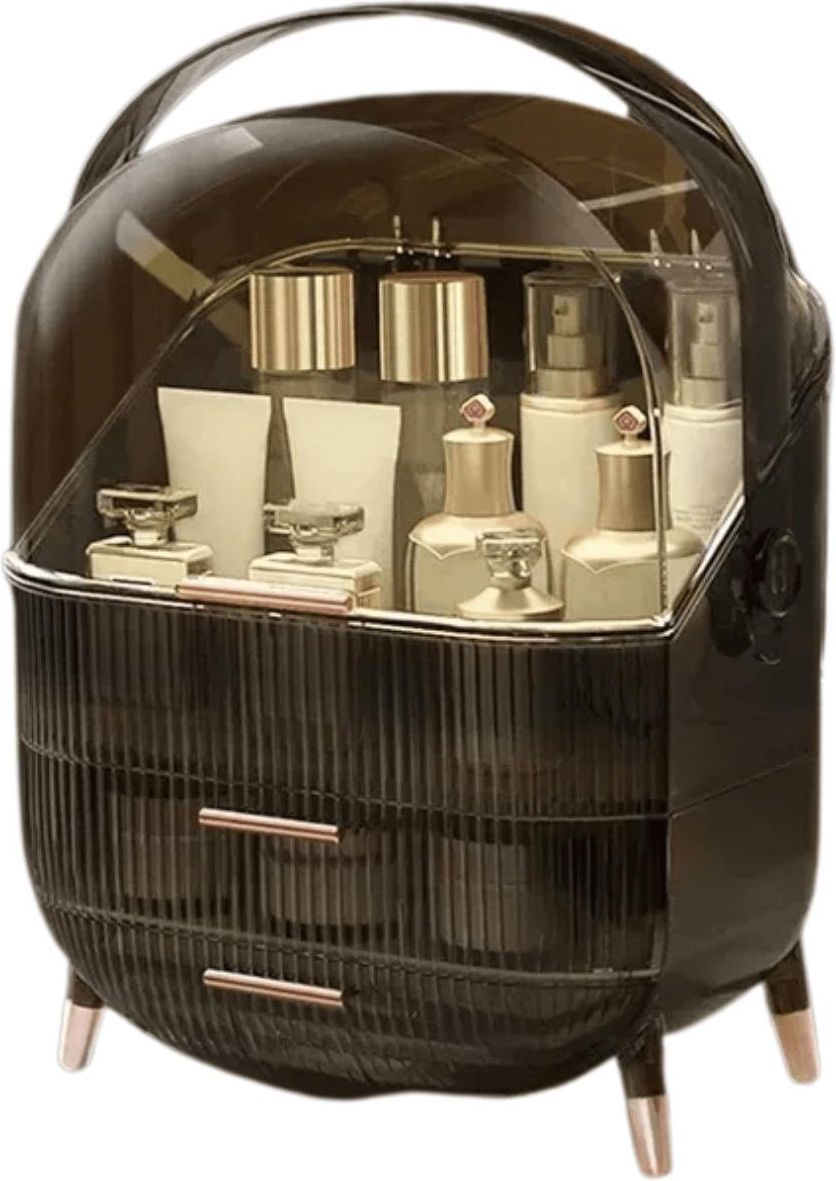 Estetyczny i wyjątkowo praktyczny organizer z akrylu pozwala na eleganckie uporządkowanie kosmetyków, biżuterii i drobnych akcesoriów. Dzięki pojemnym szufladkom oraz dużej przegródce na butelki i produkty pielęgnacyjne sprawdzi się zarówno na toaletce, jak i w łazience. Transparentne wieko ułatwia przegląd zawartości, a grafitowa kolorystyka nadaje całości ekskluzywny i dekoracyjny charakter. Korzyści dla użytkownika pomaga utrzymać porządek i łatwy dostęp do najczęściej używanych kosmetyków, mieści zarówno większe, jak i mniejsze produkty dzięki solidnej konstrukcji jest trwały i stabilny, zajmuje niewiele miejsca, a zapewnia dużą pojemność, elegancki wygląd stanowi ozdobę wnętrzał, atwy do czyszczenia i wygodny w codziennym użytkowaniu, idealny zarówno do domu, jak i jako organizer przenośny Sposób użycia Ustaw organizer na toaletce, półce lub biurku. Umieszczaj w nim kosmetyki, biżuterię i drobne akcesoria w szufladkach i większej górnej komorze. W razie potrzeby czyść wilgotną ściereczką. Specyfikacja:Materiał: akryl ABS, Wysokość: 37 cm, Szerokość: 28,6 cm, Głębokość: 18,5 cm Kolor: grafit + przezroczysty