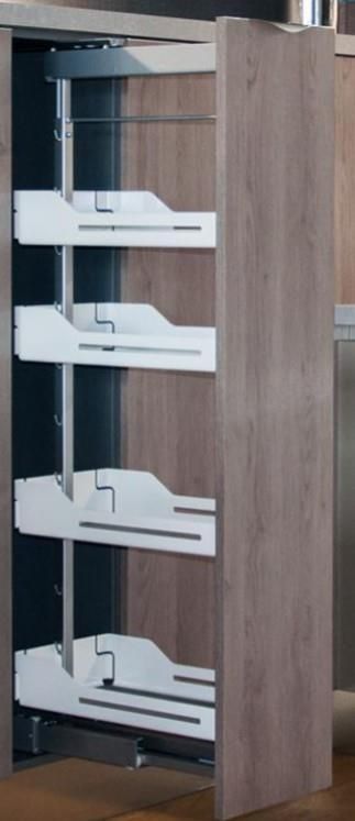 Parametry Wysokość światła szafki 1200-1600 mmGłębokość światła szafki min. 505 mm Szerokość kosza 350 mm Obciążenie całego systemu 100 kg Linia koszy Libell Kolor biały Ilość koszy 4 System Dispensa dedykowany jest do szafki typu cargo, w którym ramę systemu mocujemy od wewnętrznej strony do frontu, natomiast prowadnicę dolną i górne prowadzenie do korpusu szafki. Po wysunięciu systemu z szafki mamy doskonały dostęp do przestrzeni magazynowej zarówno z jednej jaki i z drugiej strony. Jeśli zaplanujesz rozkład szafek, tak aby cargo Dispensa, umieścić tuż obok lodówki, wówczas zgromadzone produkty suche będą w jednej strefie – nie będziesz już zbierać składników z różnych schowków, szafek i szuflad, wystarczy, że jednym ruchem wysuniesz całą zawartość szafki a wszystko będziesz mieć w zasięgu ręki. Dzięki temu funkcjonalnemu mechanizmowi Dispensa zyskujesz praktyczną przestrzeń na przechowywanie dużej ilości zapasów, a każda umieszczona rzecz jest doskonale widoczna i łatwa do zlokalizowania. Komplet dostępny jest z koszami w linii Libell. Kosz Libell wyprodukowany jest w nowoczesnej technologii z najwyższych jakości surowców. Oryginalna budowa, wykonanie z jednego metalowego odcinka sprawia, że jest wyjątkowo stabilny i równy na całej powierzchni. Dodatkowo doposażamy je w matę antypoślizgową, zapobiegającą wypadaniu i przewracaniu przechowywanych przedmiotów. Nowoczesny kształt koszy zapewnia dobre wykorzystanie każdego centymetra przestrzeni. Zaokrąglone narożniki, brak ostrych krawędzi i wąskich szczelin, ułatwiają czyszczenie i utrzymanie ich w nienagannej czystości. Rama systemu składa się z dwóch odcinków, dzięki czemu można ją swobodnie dopasować do przestrzeni szafki. Obsługiwany zakres światła szafki to 1200-1599 mm. Rama posiada wbudowane haczyki rozmieszczone co 10 cm wzdłuż całego dłuższego profilu. Takie rozwiązanie pozwala nam samemu decydować na jakiej wysokości zawiesimy koszyki. Pomimo, że rama rozciąga się około 400 mm, to ostatni haczyk jest na dolnym zakresie ramy. Przy maksymalnym rozciągnięciu ramy zalecane są przedłużki pozwalające zawiesić kosz w górnej części ramy (przedłużki o symbolu 01.44.S – nie wchodzą w skład kompletu, do dodatkowego dokupienia). W systemie zastosowana jest prowadnica z pełnym wysuwem wraz z systemem cichego domykania. Dzięki niemu wysuwanie całego carga Dispensa jest płynne i stabilne. W celu optymalnego funkcjonowania systemu zaleca się zastosowanie hamulca Soft Stopp Pro 01.265.S, który wyhamuje cargo w momencie otwierania (hamulec nie wchodzi w skład kompletu, w razie potrzeby należy go dokupić osobno). Aby cargo mogło zostać zamontowane i efektywnie użytkowane wymagana jest odpowiednia przestrzeń w szafce. Specyfikacja techniczna: system do szafek o szerokości frontu: 400 mm, szerokość koszyka: 350 mm, szerokość światła szafki: około 360-409 mm, minimalna głębokość światła szafki: 505 mm, maksymalna wysokość światła szafki: 1200-1599 mm, maksymalne obciążenie pojedynczego koszyka: 18 kg, maksymalne obciążenie całego systemu wraz z frontem: 100 kg, Zestaw zawiera: 1 ramę, składającą się z dwóch odcinków, 1 prowadnicę z pełnym wysuwem wraz z górnym prowadzeniem, 1 komplet mocowań frontu (2 szt.), 1 obejmę mocującą ramę do frontu, 4 szt. koszyków w kolorze białym, 4 szt. mat antypoślizgowych w kolorze antracytowym. Do swobodnego wysunięcia carga, należy stosować standardowe uchwyty meblowe. W przypadku otwierania szafki bezuchwytowo należy osobno zamówić system elektryczny eTouch (01.341.B lub 01.340.S). Kompletny zestaw systemu Dispensa wraz z szafką pokazany na zdjęciach jest tylko propozycją aranżacji i jako całkowity komplet nie stanowi oferty sprzedażowej. Szafkę należy wykonać w własnym zakresie. W celu wzmocnienia dna szafki prosimy stosować dodatkową piątą nóżkę pod dolnym wieńcem.