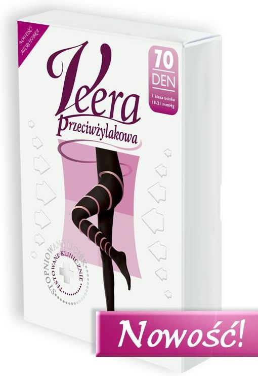 Veera Rajstopy przeciwżylakowe 70 DEN Microfibra Kolor czarnyI stopień ucisku 13-17 mmHgNajwyższej jakości eleganckie rajstopy Veera ze stopniowanym uciskiem. Poprawiają krążenie i perfekcyjnie modelują sylwetkę. Stosowane w profilaktyce i przy pierwszych problemach z krążeniem. Nadają lekkości nawet najbardziej zmęczonym nogom. Przynoszą szybką i skuteczną ulgę w przypadku pierwszych objawów osłabionego krążenia, takich jak:obrzęk i zmęczenie nóg;uczucie ciężkości nóg i pajączki (pękające naczynka).Veera Rajstopy Przeciwżylakowesą testowane klinicznie, niezwykle trwałe, nie puszczają oczek za sprawą specjalnego splotu plastra miodu, wykonane z przyjemnego w dotyku materiału z dodatkiem Lycry. Posiadają wzmocnione pięty i palce, dzięki czemu są bardzo trwałe i odpowiednio układają się na nodze, ucisk zaś działa we właściwych miejscach.Rajstopy Przeciwżylakowe byVeera wyprodukowane w technologiiSilver+, zawierają jony srebra. Dbają o komfort i zdrowie Twoich nóg na każdym kroku. Wielokrotnie nagradzane przez Konsumentów.Zastosowanie:uczucie ciężkich nóg;zapobieganie żylakom nóg;wspomaganie krążenia kończyn dolnych.Właściwości:70 DEN - ucisk profilaktyczny 13-17 mmHg;zmniejszenie uczucia zmęczonych nóg;ból nóg pod koniec dnia;bolące i spuchnięte nogi (obrzęk w okolicy kostki ustępujący po przespanej nocy);przynoszą ulgę zmęczonym nogom;poprawiają krążenie krwi;zapobiegają pierwszym zmianom żylakowym;zapobiegają pojawianiu się pajączków;perfekcyjnie modelują i wyszczuplają s