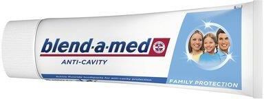 Podstawowe informacje o Blend-a-med Anti-Cavity Family Protection Pasta do zębówBlend-a-med Anti-Cavity Family Protection to pasta do zębów opracowana z myślą o skuteczniej higienie jamy ustnej oraz ochronie przed próchnicą całej rodziny. Produkt odpowiedni dla dzieci powyżej 6. roku życia.Działanie i właściwościPasta do zębów Blend-a-med Anti-Cavity przeznaczona dla całej rodziny. Produkt zapewnia ochronę przed próchnicą i nieświeżym oddechem. Dzięki wzbogaceniu formuły w Calcident, pasta pomaga zatrzymywać wapń w zębach, aby stały się mocniejsze i bardziej odporne na szkodliwe działanie cukrów.Chroni przed ubytkami. Pasta do zębów z fluorem. Pasta do zębów o smaku mięty. Idealna dla dorosłych i dzieci od 6 roku życia.Zastosowanie/wskazaniaDo codziennej higieny jamy ustnej dorosłych i dzieci powyżej 6. roku życia.SkładnikiIngredients: Aqua, Hydrated Silica, Sorbitol, Sodium Lauryl Sulfate, Cellulose Gum, Aroma, Sodium Fluoride (fluorek sodu), Sodium Saccharin, Carbomer, CI 77891, Trisodium Phosphate, Limonene, Polysorbate 80, CI 74260.Zawiera fluorek sodu (1450 ppm fluoru). Blend-a-med Anti-Cavity Family Protection – stosowanieNałóż niewielką ilość pasty na szczoteczkę, a następnie szczotkuj zęby przez minimum 2 minuty. Stosuj dwa razy dziennie. Przeciwwskazania Nie stosować w przypadku nadwrażliwości na jakikolwiek składnik pasty. Działania niepożądane/skutki uboczne Brak. Ostrzeżenia i środki ostrożności Nie połykać. Blend-a-med Anti-Cavity Family Protection a ciąża i karmienie piersią Brak przeciwwskazań do stosowania. W razie wątpliwości skonsultować z lekarzem. Przechowywanie Przechowywać w temperaturze pokojowej, poza zasięgiem dzieci. Opakowanie 75 ml