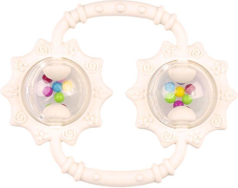 Grzechotka i gryzak 2w1 "Słoneczniki" Ta urocza zabawka łączy w sobie funkcjonalność grzechotki i gryzaka, zapewniając maluchowi radość i ulgę podczas ząbkowania. Dzięki przemyślanemu designowi i kolorowym elementom, szybko stanie się ulubioną zabawką najmłodszych! Cechy produktu: Grzechotka z kolorowymi koralikami – dwie kule wypełnione koralikami wydają wesołe dźwięki przy potrząsaniu, zachęcając malucha do zabawy. Gryzak z wypustkami – miękkie obręcze w kształcie słoneczników ozdobione wypustkami masują obolałe dziąsła, przynosząc ulgę w czasie ząbkowania. Ergonomiczny uchwyt – wygodne uchwyty ułatwiają małym rączkom chwytanie i manipulowanie zabawką. Bezpieczna i przyjazna dla dziecka – wykonana z materiałów dostosowanych do potrzeb niemowląt. Dla dzieci od 3. miesiąca życia Grzechotka i gryzak "Słoneczniki" to idealny sposób na stymulację zmysłów, rozwijanie zdolności motorycznych oraz ukojenie podczas ząbkowania. Niezastąpiony towarzysz w pierwszych miesiącach życia!