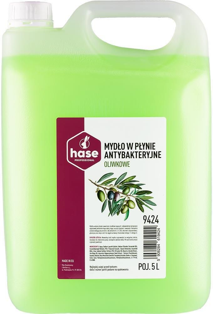 Mydło w płynie HASE OLIWKA antybakteryjne 5l Hase Oliwkowe mydło antybakteryjne marki Hase: zawiera środki myjące, które delikatnie, lecz skutecznie oczyszczają skórę z codziennych zabrudzeń efektywnie myje dłonie, zabezpieczając skórę przed podrażnieniem dzięki właściwościom antybakteryjnym, eliminuje drobnoustroje, gwarantując uczucie higienicznej czystości wzbogacone zostało o kompleks witamin A, E, H i B5, jak i również ekstrakt z kasztanowca, glicerynę oraz oleje roślinne. Substancje te silnie nawilżają, zmiękczają oraz odżywiają skórę, zauważalnie poprawiając jej kondycję rozpieszcza skórę i zmysły miłym, oliwkowym zapachem.