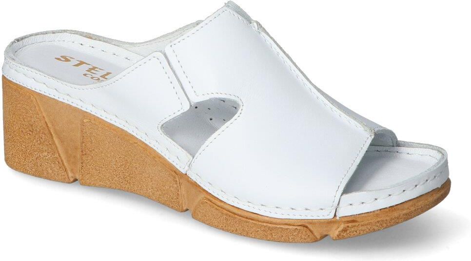 Stylowe klapki damskie firmy Stella :- cholewka wykonana ze skóry naturalnej licowej - wnętrze wykonane ze skóry naturalnej zapewnia komfort podczas użytkowania - skórzana wkładka wewnętrzna - koturn o wysokości 6 cm doskonale stabilizuje stopę - biały kolor i modny fason tworzą idealne połączenie!