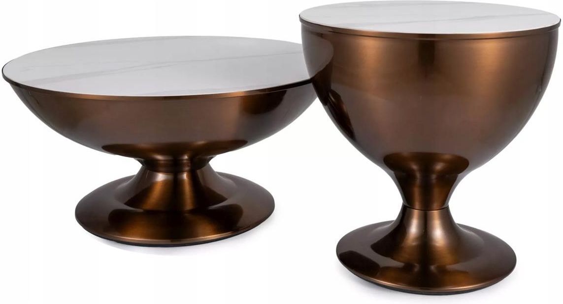 Signal Meble - Elegancja, Funkcjonalność, Unikalny Styl ZESTAW STOLIKÓW ŁAW DO SALONU POKOJU DZIENNEGO BIAŁY MIEDZIANY SALSA SIGNAL Zestaw ław, blat: ceramika, stelaż: metal, kolor: biały mat, efekt marmuru / miedziany połysk. Dane techniczne Ilość stolików w zestawie: 2 stoliki Średnica stolika 1: 75 cm Wysokość stolika 1: 38 cm Średnica stolika 2: 50 cm Wysokość stolika 2: 52 cm Waga: 40 kg Rodzaj: zestaw ław Kolor stelaża: miedziany połysk Materiał stelaża: metal Kształt: okrągły Kolor blatu: biały mat, efekt marmuru Materiał blatu: ceramika Rozkładany: NIE