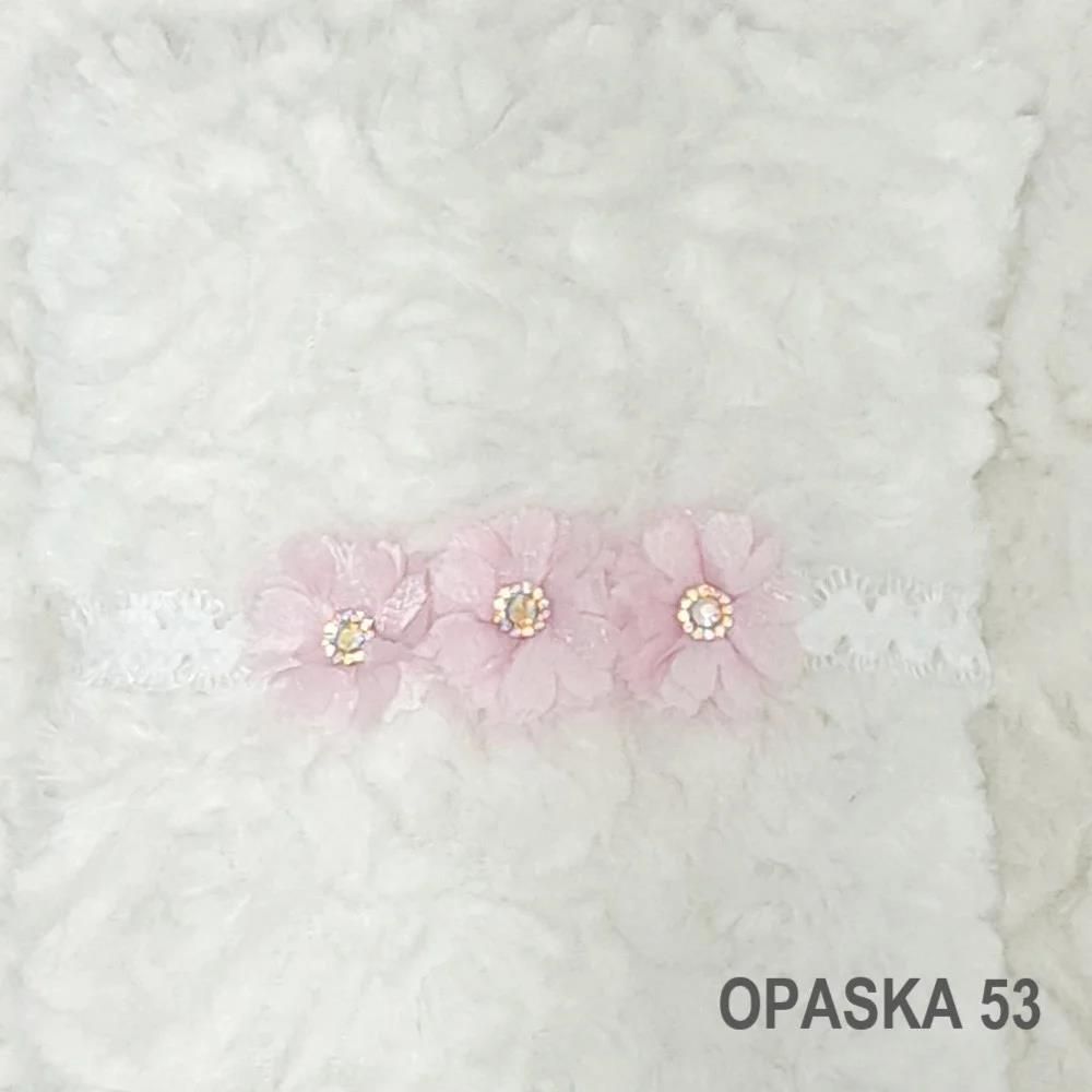 OPASKA DO CHRZTU dla dziewczynki biała OPASKA USZYTA PRZEZ NAS Z NAJLEPSZEJ JAKOŚCI BARDZO MIŁEJ I PRZYJEMNEJ W DOTYKU GUMOWANEJ ELASTYCZNEJ KORONKI POLECANA NA LATO, PÓŹNĄ WIOSNĘ I WCZESNĄ JESIEŃ OPASKA ELEGANCKO WYKOŃCZONA I OZDOBIONA WDZIĘCZNYMI, PIĘKNYMI KOLOROWYMI KWIATKAMI. Tkanina poliester 100 %. Obwód głowy rozmiar 56 36 - 38 cm, rozmiar 62 38 - 40 cm, rozmiar 68 40 - 42 cm, rozmiar 74 42 - 44 cm, rozmiar 80 44 - 46 cm, rozmiar 86 46 - 48 cm DO OPASKI IDEALNIE PASUJE SUKIENKA, BOLERKO, SWETEREK, TOREBKA, PŁASZCZ I BUCIKI KTÓRE MOŻNA KUPIĆ ODDZIELNIE. WSZYSTKO WYKONANE Z WIELKĄ STARANNOŚCIĄ I DBAŁOŚCIĄ O SZCZEGÓŁY. PERFEKCYJNIE WYKOŃCZONE.